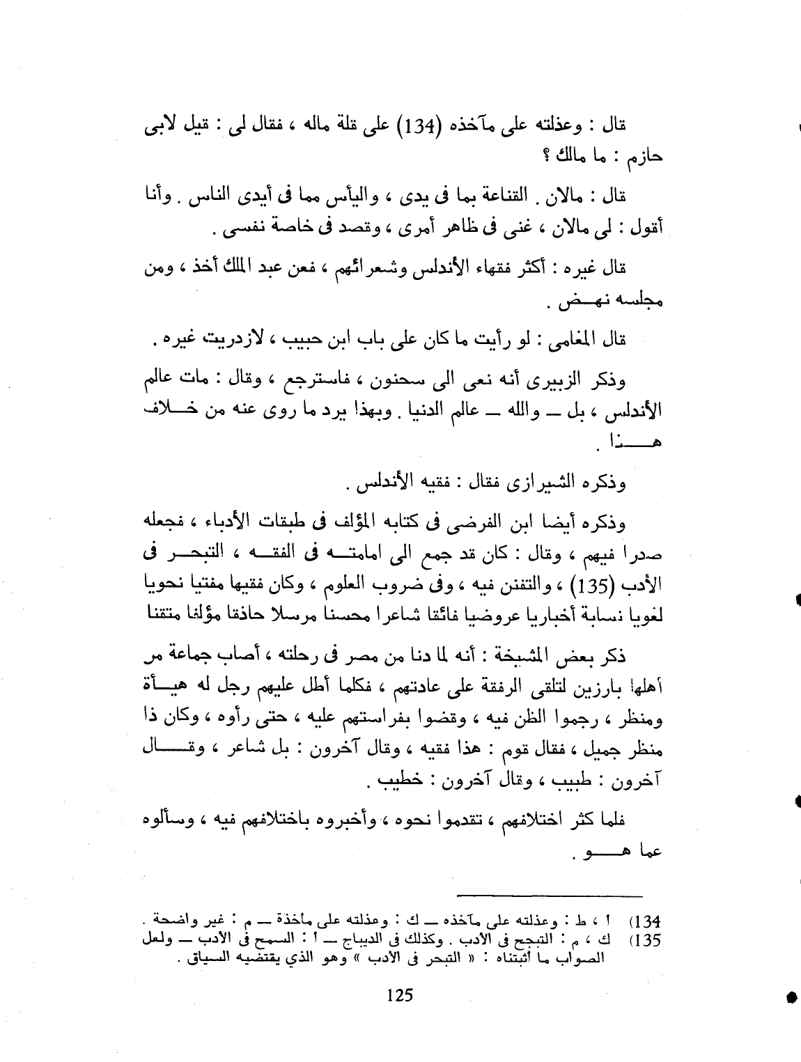 قال: وعذلته على مأخذه على قلة ماله. فقال لي: قيل لأبي حازم، ما مالك؟ قال: مالان: القناعة بما في يدي، واليأس مما في أيدي الناس. وأنا أقول: لي مالان غنائي في ظاهر أمري، وقصدي خاصة نفسي. قال غيره: أكثر فقهاء الأندلس وشعرائهم، فعن عبد الله أخذوا، وعن مجلسه نهض. قال المغامي: لو رأيت ما كان على باب ابن حبيب، لازدريت غيره. ذكر الزبيدي أنه نعي الى سحنون، فاسترجع وقال: مات عالم الأندلس، بل والله عالم الدنيا. وهذا يرد ما روي عنه من خلاف هذا. وذكره الشيرازي فقال فيه: فقيه الأندلس. وذكره أيضاً ابن الفرضي في كتابه المؤلف في طبقات الأدباء فجعله صدراً فيهم. وقال: كان قد جمع الى إمامته في الفقه والتنجيح في الأدب، والتفنن فيه في ضروب العلوم. وكان فقيهاً مفتياً نحوياً لغوياً، نسّابة إخبارياً عروضياً فائقاً. شاعراً محسناً مرسلاً حاذقاً. مؤلفاً متفنناً. ذكر بعض المشيخة، أنه لما دنا من مصر، في رحلته أصاب جماعة من العلماء بارزين لتلقي الرفقة على عادتهم، فكلما أطل عليهم رجل له هيبة ومنظر، رجحوا الظن به، وقضوا بفراستهم عليه، حتى رأوه، وكان ذا منظر جميل، فقال قوم: هذا فقيه. وقال آخرون: شاعر. وقال آخرون: طبيب. وقال آخرون: خطيب. فلما كثر اختلافهم تقدموا نحوه، وأخبروه باختلافهم فيه، وسألوه عن ما هو؟
