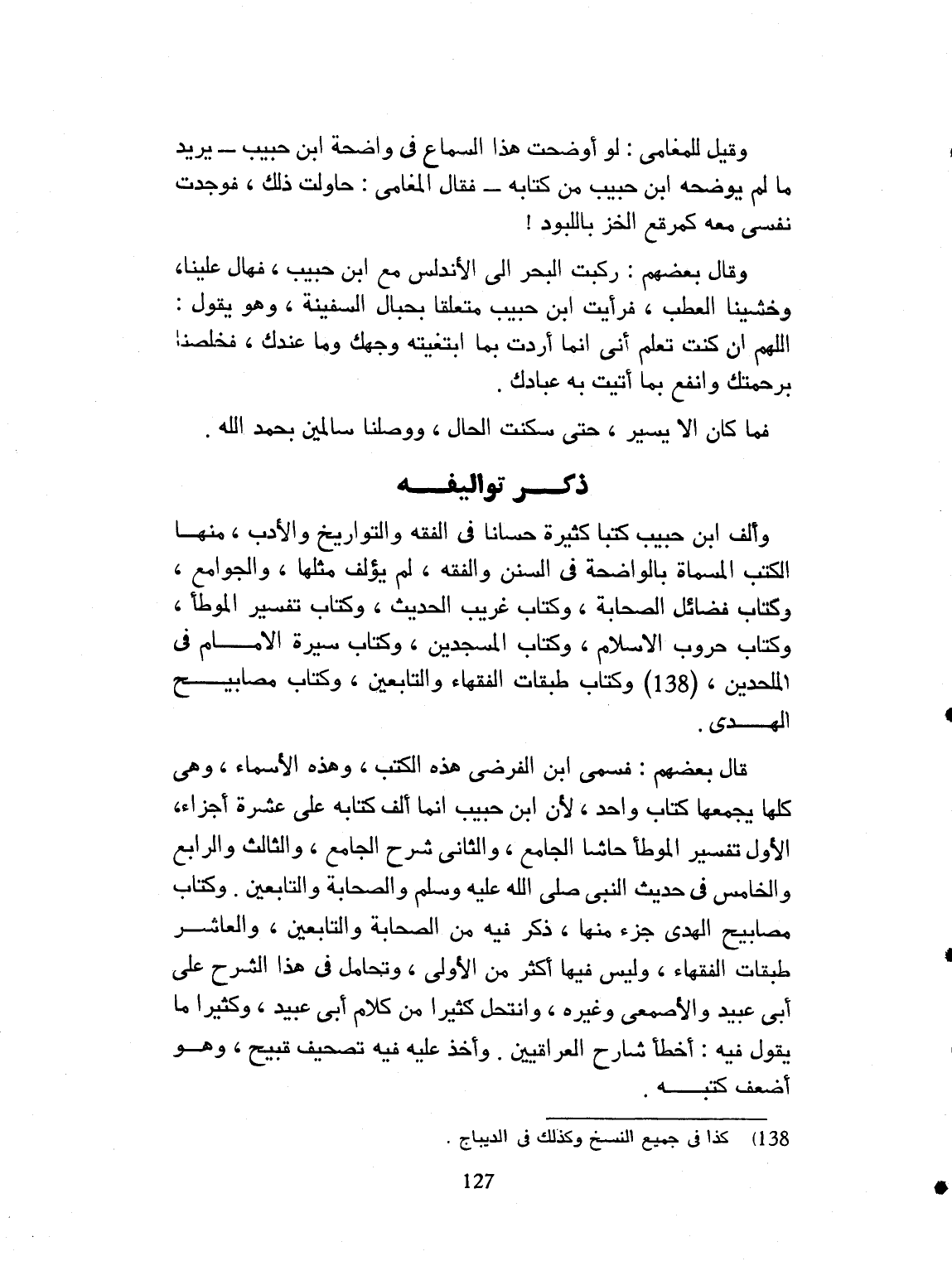 حاولت نفسي من ذلك، فوجدت نفسي معه كمرقع الخز باللبود. فقال بعضهم: ركبت البحر الى الأندلس، مع ابن حبيب، فهال علينا وخشينا العطب، فرأيت ابن حبيب متعلقاً بحبل السفينة وهو يقول: اللهم إن كنت تعلم أني إنما أردت بما أفتيته لوجهك وما عندك فخلصني برحمتك وانفع بما آتيتنا به عبادك. فما كان يسيراً حتى سكنت الحال، ووصلنا سالمين بحمد الله. لت نفسي من ذلك، فوجدت نفسي معه كمرقع الخز باللبود. فقال بعضهم: ركبت البحر الى الأندلس، مع ابن حبيب، فهال علينا وخشينا العطب، فرأيت ابن حبيب متعلقاً بحبل السفينة وهو يقول: اللهم إن كنت تعلم أني إنما أردت بما أفتيته لوجهك وما عندك فخلصني برحمتك وانفع بما آتيتنا به عبادك. فما كان يسيراً حتى سكنت الحال، ووصلنا سالمين بحمد الله.