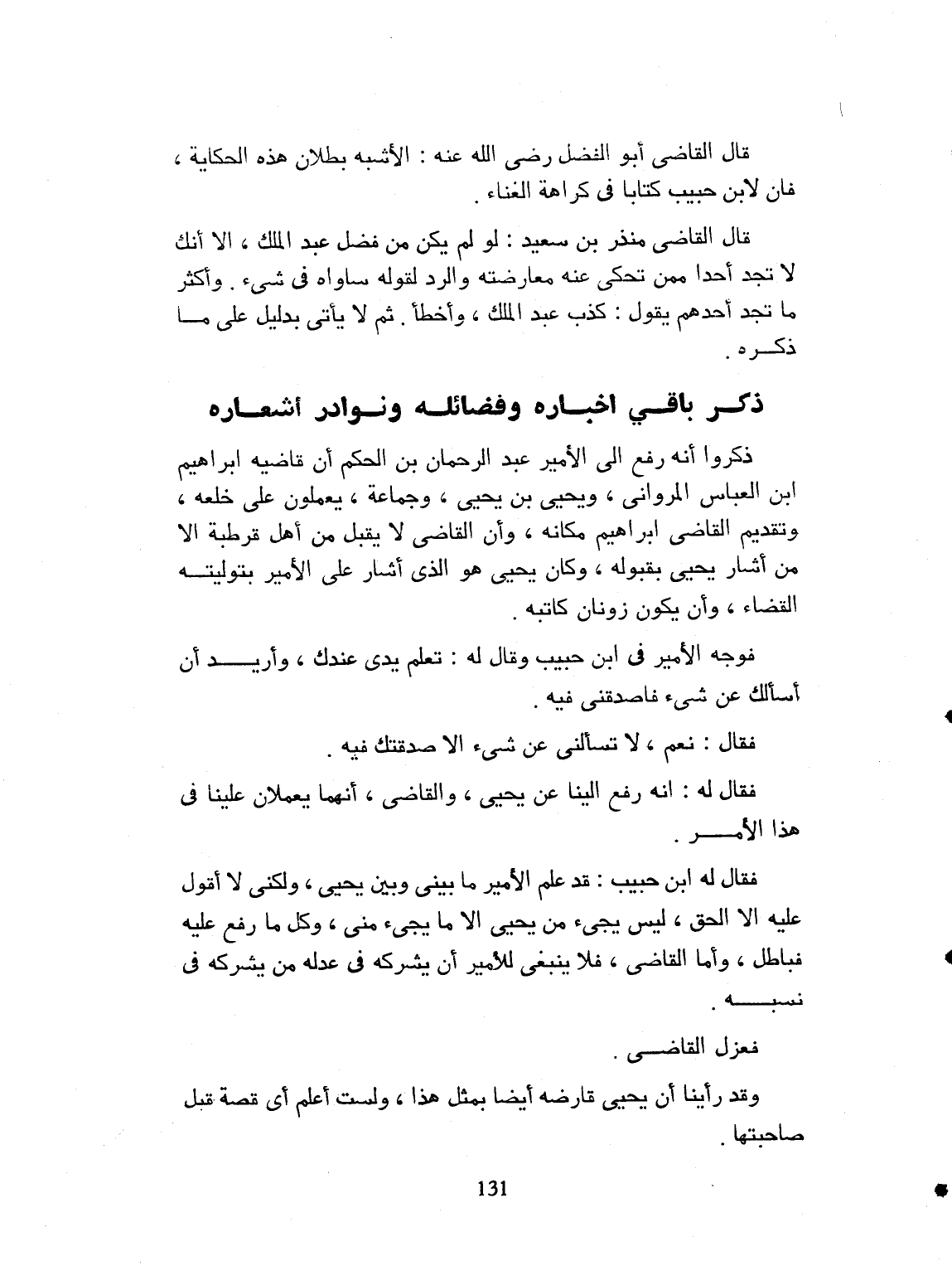قال القاضي أبو الفضل رضي الله تعالى عنه: الأشبه بطلان هذه الحكاية. فإن لابن حبيب كتاباً في كراهة الغناء. قال القاضي منذر بن سعيد: لو لم يكن من فضل عبد الملك، إلا أنك لم تجد لمن يحكي عنه معارضته والرد لقوله ساواه في شيء. وأكثر ما نجد أحدهم يقول: كذب عبد الملك، أو أخطأ ولا يأتي بدليل على ما ذكره.
