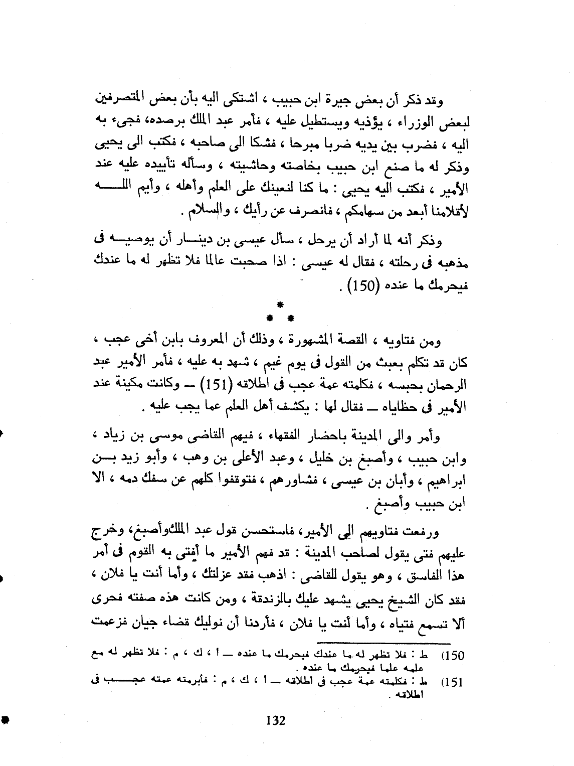 فأمر عبد الملك برصده، فجيء به إليه، فضرب بين يديه ضرباً مبرحاً، فشكا الى صاحبه فكتب الى يحيى بن يحيى، فذكر له ما صنع ابن حبيب، بصاحبه وحاشيته. وسأله تأييده عليه عند الأمير. فكتب إليه يحيى: ما كنا نعينك على العلم وأهله، وأيم الله لأقلامنا أنفذ من سهامكم. فانصرف عن رأيك والسلام. وذكر أنه لما أراد أن يرحل، سأل عيسى بن دينار، أن يوصيه في مذهبه في رحلته، فقال له عيسى: إذا أصبت عالماً، فلا تظهر له مع علمه علماً، فيحرمك ما عنده. ومن فتاويه القصة المشهورة، وذلك أنه فيما ذكر أن المعروف بابن أخي عجَب، كان قد تكلم بعبث من القول في يوم غيم، شهد به عليه، فأمر الأمير عبد الرحمن بحبسه فأبرمته عمته عجب في إطلاقه. وكانت مكينة عند الأمير في حظاياه. فقال لها: نكشف أهل العلم، عما يجب عليه. وأمر والي المدينة بإحضاء الفقهاء، وفيهم القاضي موسى بن زياد وابن حبيب وأصبغ بن خليل، وعبد الأعلى بن وهب، وأبو زيد بن ابراهيم وابان بن عيسى.