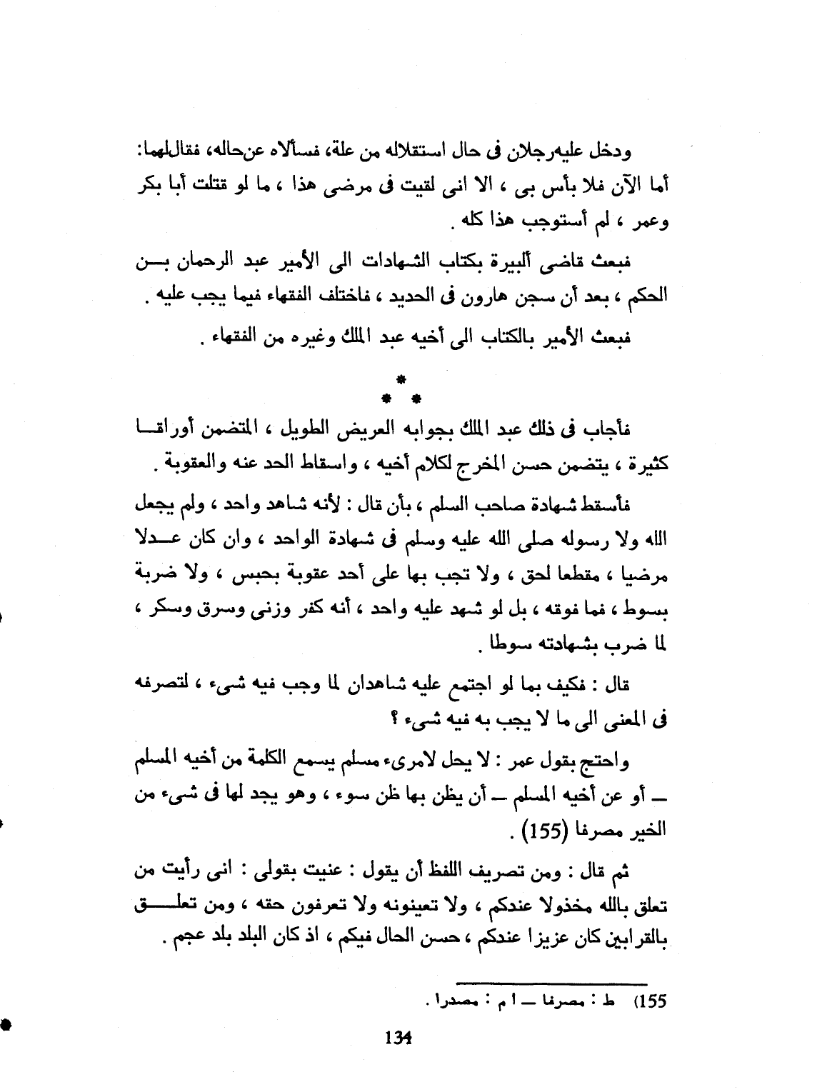 ودخل عليه رجلان، في حال استبلاله من علة. فسألاه عن حاله. فقال لهما: أما الآن فلا بأس بي، إلا أني لقيت في مرضي هذا، ما لو قتلت أبا بكر وعمر لم أستوجب هذا كله. فبعث قاضي البيرة بكتاب الشهادات الى الأمير عبد الرحمن بن الحكم، بعد أن سجن هارون في الحديد، فاختلف الفقهاء فيما يجب عليه. فبعث الأمير بالكتاب الى أخيه عبد الملك وغيره من الفقهاء. فأجاب في ذلك عبد الملك بجوابه العريض الطويل، المتضمن أوراقاً كثيرة. يتضمن حسن المخرج بكلام أخيه، وإسقاط الحد عنه، والعقوبة، فأسقط شهادة صاحب السلم بأن قال: هو شاهد واحد. ولم يجعل الله ولا رسوله صلى الله عليه وسلم في شهادة الواحد. وإن كان مرضياً قطعها مقطعاً بحق. ولا يجب بها على أحد عقوبة بحبس ولا ضربة بسوط، فما فوقه بلاء. لو شهد عليه أحد أنه كفر وزنى وسرق وسكر لما ضرب بشهادته سوطاً. قال فكيف لو اجتمع عليه شاهدان، لما وجب عليه فيه شيء لتصرفه في المعنى، الى ما لا يجب به فيه شيء. واحتج بقول عمر لا يحل لامرئ مسلم يسمع الكلمة من أخيه المسلم أو عن أخيه المسلم أن يظن بها ظن سوء وهو يجد لها في شيء من الخير مصدراً. ثم قال: ومن تصريف اللفظ أن يقول: عنيت بقولي إني رأيت من تعلق بالله مخذولاً عندكم. ولا تعينونه، ولا تصرفون حقه. ومن تعلق بالقرابين كان عزيزاً عندكم، حسن الحال فيكم. إذا كان البلد بلد عجم،