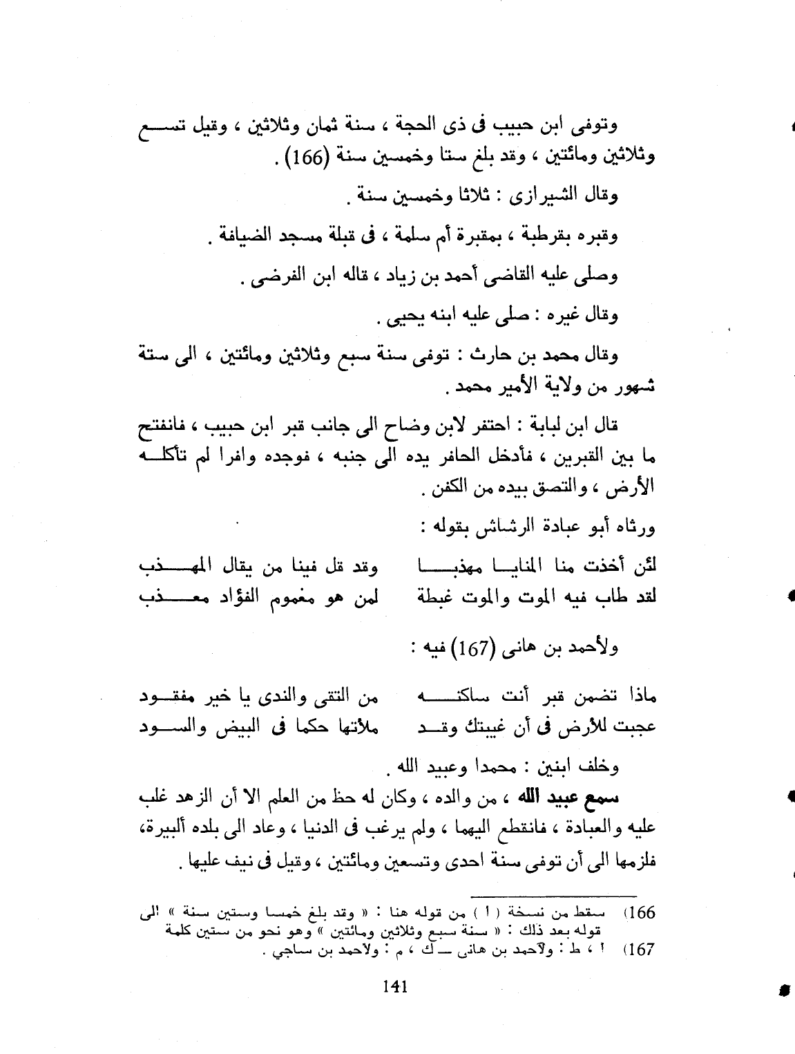 وتوفي ابن حبيب في ذي الحجة، سنة ثمان وثلاثين، وقيل تسع وثلاثين ومائتين. وقد بلغ سنة ستاً وخمسين سنة. وقال الشيرازي ثلاثاً وخمسين سنة. وقبره بقرطبة أم سلمة في قبلة مسجد الضيافة. وصلى عليه ابنه يحيى. وقال محمد بن حارث: توفي سنة سبع وثلاثين ومائتين إلا ستة شهور في ولاية الأمير محمد. قال ابن لبابة: حفر الى ابن وضاح الى جانب قبر ابن حبيب فانفتح ما بين القبرين فأدخل الحافر يده الى جنبه، وافر؟ لم تأكله الأرض. والتصق بيده من الكفن ورثاه أبو عبادة الرشاش وغيره: