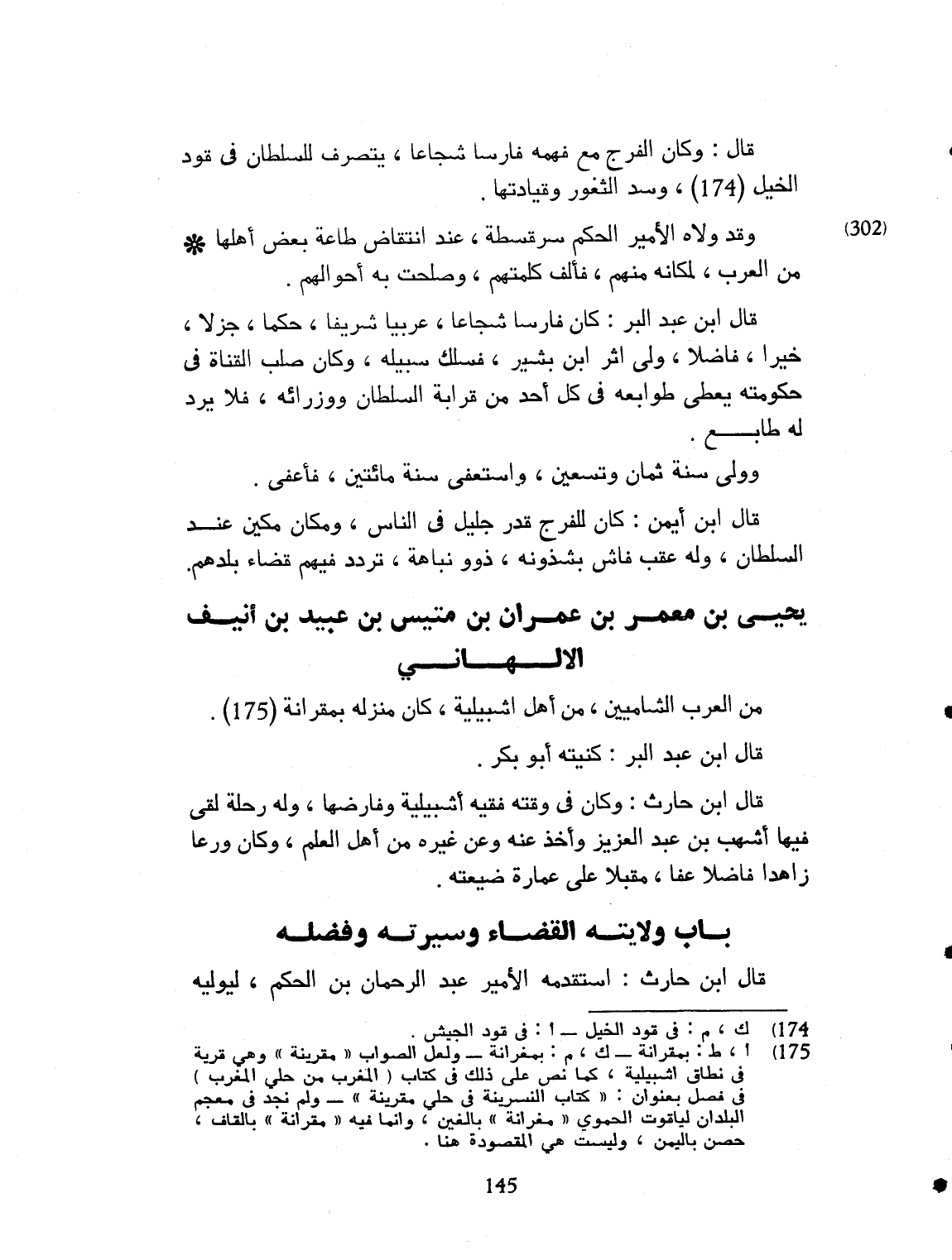 قال: وكان الفرج مع فهمه فارساً شجاعاً، يتصرف للسلطان في قود الخيل وسد الثغور، وقيادتها. وقد ولاه الأمير الحكم، سرقسطة عند انتقاض طاعة بعض أهلها، من الغرب. لمكانه منهم. فألف كلمتهم وصلحت به أحوالهم. قال ابن عبد البر: كان فارساً شجاعاً شريفاً حكيماً جزلاً خيراً فاضلاً. ولي أثر ابن بشير فسلك سبيله. وكان صلب القناة في حكومته يعطي طوابعه في كل أحد من قرابة السلطان ووزرائه. فلا يرد له طابع. ولي سنة ثمان وتسعين واستعفى سنة مائتين فأعفي. قال ابن أيمن: كان للفرج قدر جليل، في الناس، ومكان عند السلطان. وله عقب فاش بشذونة. ذوو نباهة تردد فيهم قضاء بلدهم.