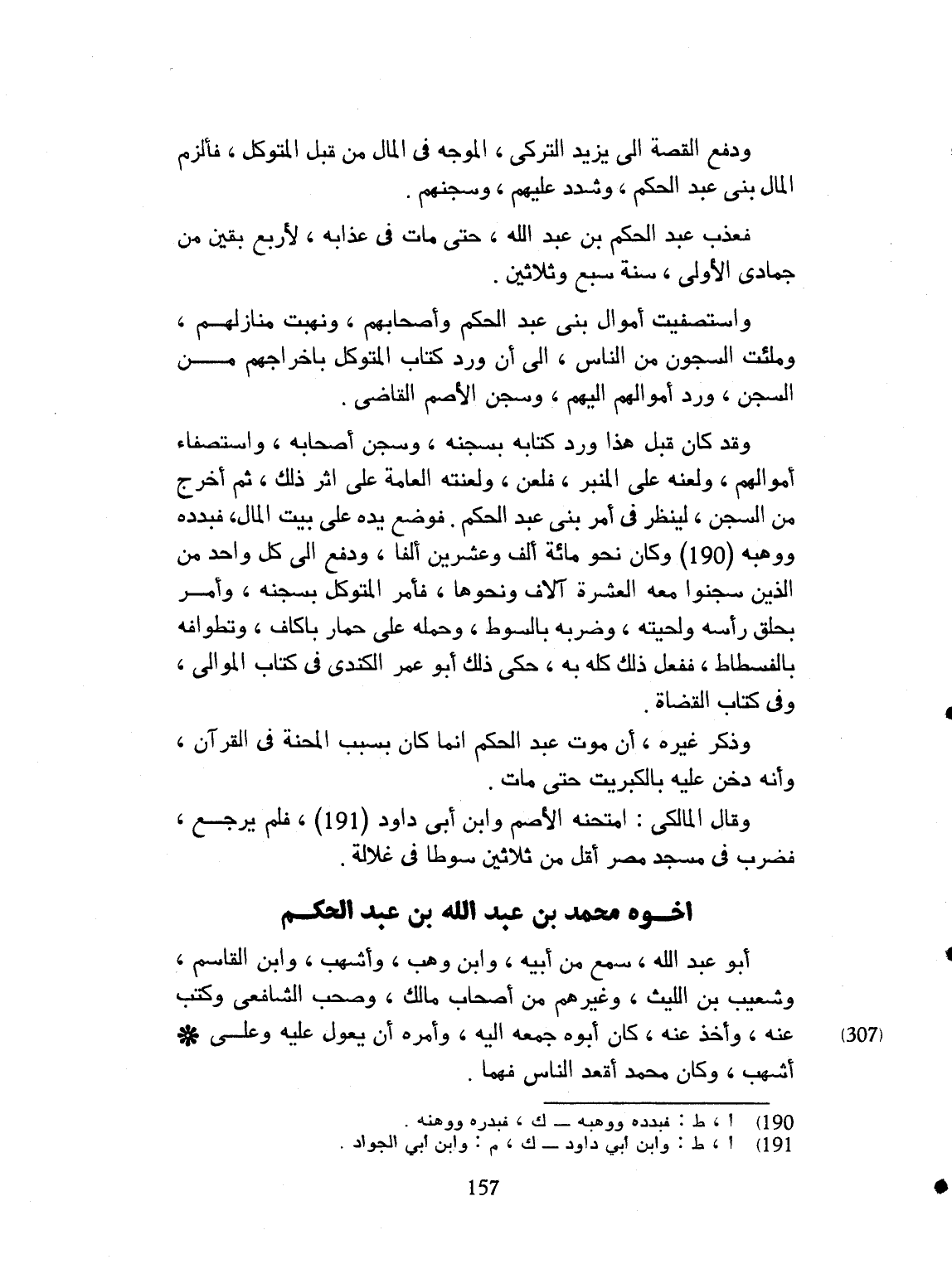 ودفع القصة الى يزيد التركي، الموجه في الحال من قبل المتوكل. فألزم المال بني عبد الحكم، وشدد عليهم، وسجنهم. فعذب عبد الحكم بن عبد الله حتى مات في عذابه، لأربع بقين من جمادى الأولى سنة سبع وثلاثين. واستصفيت أموال بني الحكم وأصحابهم، ونهبت منازلهم، وملئت السجون من الناس، الى أن ورد كتاب المتوكل بإخراجهم من السجن، ورد أموالهم إليهم، وسجن الأصم القاضي، وقد كان ورد قبل هذا كتابه بسجنه، وسجن أصحابه، واستصفاء أموالهم، ولعنه على المنبر، فلعن. ولعنته الأمة على إثر ذلك. ثم أخرج من السجن، لينظر في أمر بني عبد الحكم، فوضع يده على بيت المال، فبذره. وذلك نحو مائة ألف وعشرين ألفاً. ودفعوا الى كل واحد منهم من الذين سجنوا معه العشرة الآلاف ونحوها، فأمر المتوكل بسجنه، وأمر بحلق رأسه ولحيته، وضربه بالسوط. وحمله على حمار بأكافٍ، وتطويفه بالفسطاط، ففعل ذلك كله به. وحكى ذلك أبو عمر الكندي، في كتاب الموالي، وفي كتاب القضاة. وذكر غيره، أن موت عبد الحكم إنما كان بسبب المحنة في القرآن، وأنه دخّن عليه بالكبريت حتى مات. وقال المالكي: سجنه الأصم وابن أبي الجواد فلم يرجع. فضرب في مسجد مصر أقل من ثلاثين سوطاً في خلافته.