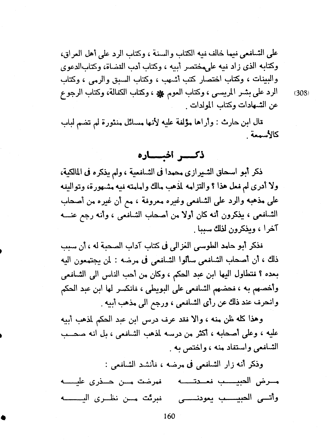 على الشافعي، فيما خالف فيه الكتاب والسنة، وكتاب الرد على أهل العراق، وكتابه الذي زاد فيه على مختصر أبيه، وكتاب أدب القضاة، وكتاب الدعوات والبينات، وكتاب اختصار كتاب أشهب، وكتاب السبق والدين، وكتاب الرد على بشر المريسي، وكتاب الصوم وكتاب الكفالة، وكتاب الرجوع عن الشهادات، وكتاب المؤيدات. قال ابن حارث: وأرى أنها مولفة عليه. لأنها مسائل منثورة لم تضم لباب كالأسمعة.