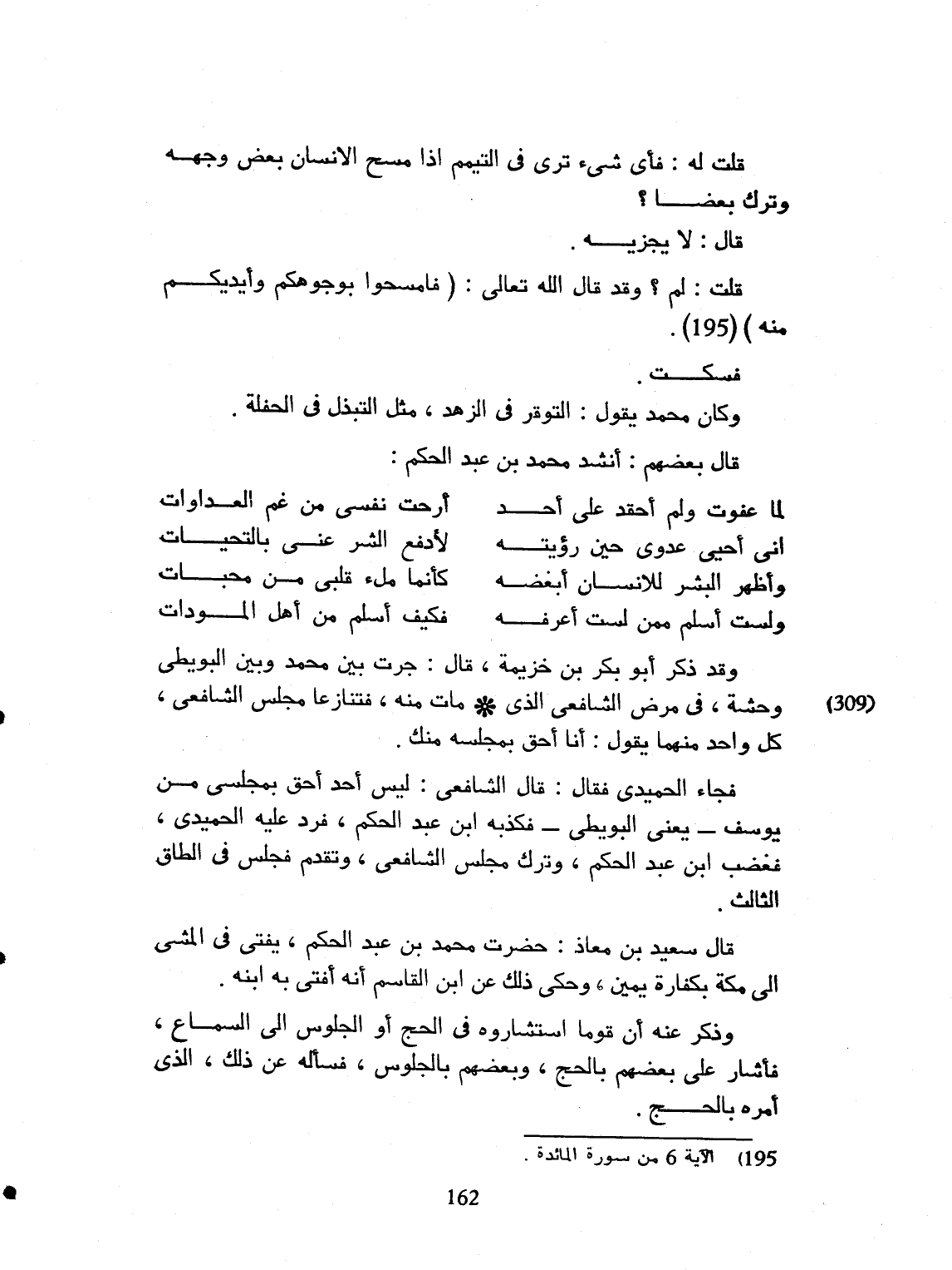 قلت له: فأي شيء ترى في التيمم، إذا مسح الإنسان بعض وجهه وترك بعضاً. قال: لا يجزيه. فقلت له: لم وقد قال الله تعالى فامسحوا بوجوهكم وأيديكم منه. فسكت. وكان محمد يقول: التوقر في الزهد، مثل التبذل في الحفلة. قال بعضهم: أنشد محمد بن عبد الحكم: