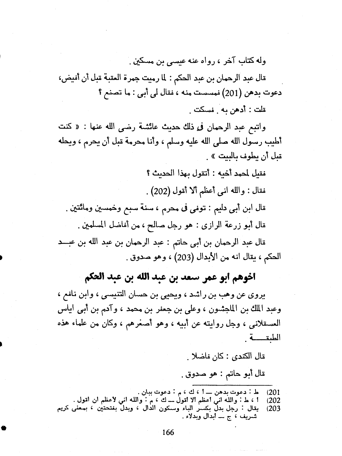 وله كتاب آخر، رواه عنه عيسى بن مسكين. قال عبد الرحمن بن الحكم: لما رميت جمرة العقبة، قبل أن أفيض، دعوت ببان فمسيت منه. فقال لي أبي: ما تصنع. قلت ادهن به، فسكت. واتبع عبد الرحمن في ذلك حديث عائشة. كنت أطيّب رسول الله صلى الله عليه وسلم وهي محرمة. قبل أن يحرم، وبحله قبل أن يطوف بالبيت. فقيل لمحمد أخيه أتقول بهذا الحديث. فقال: والله إني لا أعظم أن لا أقول؟ قال ابن أبي دليم: توفي في محرم سنة سبع وخمسين ومائتين. قال أبو زرعة الرازي: هو رجل صالح من أفاضل المسلمين. قال عبد الرحمن بن أبي حاتم: عبد الرحمن بن عبد الله بن عبد الحكم. يقال إنه من الأبدال وهو صدوق.