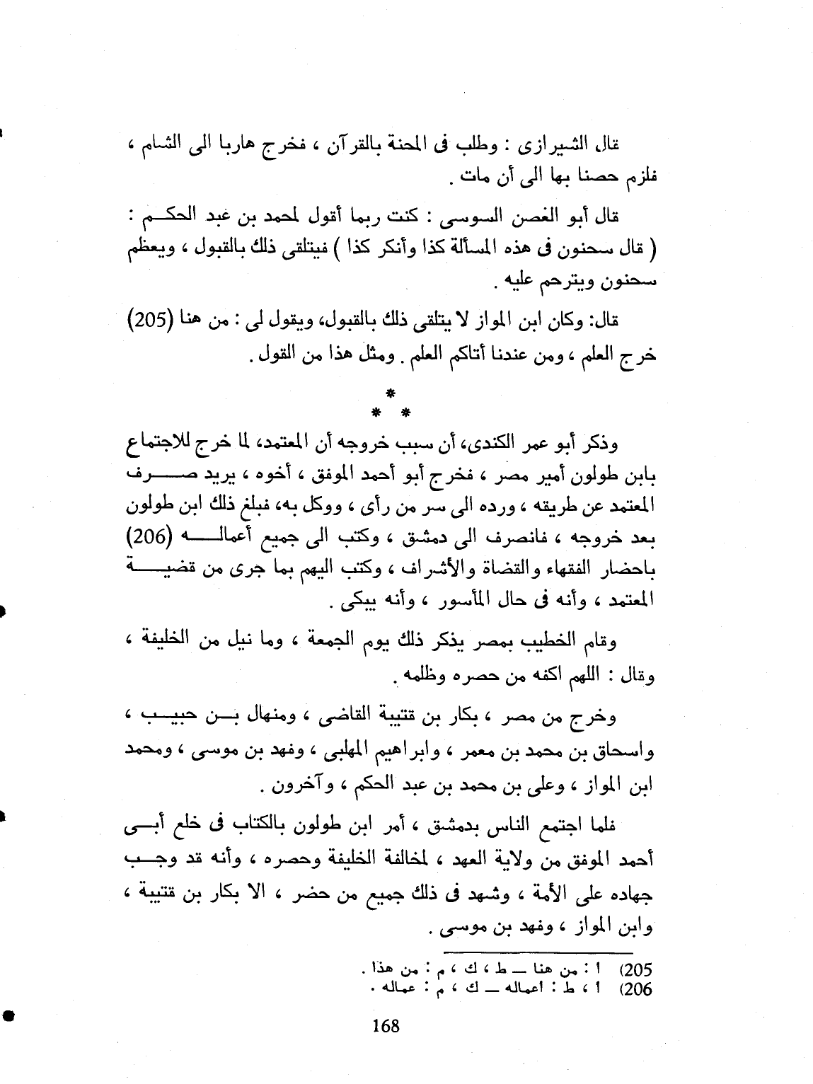 قال الشيرازي: وطلب في المحنة بالقرآن فخرج هارباً الى الشام. فلزم حصناً بها الى أن مات. قال أبو نصر السوسي: كنت ربما أقول قال محمد بن عبد الحكم: قال سحنون، في هذه المسألة كذا. وأنكر كذا. فيتلقى ذلك بالقبول ويعظم عندي ويترحم عليه. قال: وكان ابن المواز، لا يتلقى ذلك بالقبول. ويقول لي من هذا خرج العلم، ومن عندنا أتاكم. ومثل هذا من القول. وذكر أبو عمر الكندي أن سبب خروجه، أن المعتمد لما خرج للاجتماع بطولون، أمير مصر فخرج أبو أحمد الموفق أخوه، يريد صرف المعتمد عن طريقه ورده الى سر من رأى، ووكل به. فبلغ ذلك ابن طولون بعد خروجه فانصرف الى دمشق، وكتب الى جميع عماله بإحضار الفقهاء والقضاة والأشراف، وكتب إليهم بما جرى من قضية المعتمد، وأنه في حالة المأسور، وأنه يبكي. وقال الخطيب بمصر يذكر ذلك يوم الجمعة، وما قيل في الخليفة. وقال اللهم اكفه من حصره وظلمه، وخرج من مصر بكار بن قتيبة القاضي، ومنهال بن حبيب، وإسحق بن محمد بن معمر وابراهيم المهلبي وفهد بن موسى، ومحمد المواز، وعلي بن محمد بن عبد الكريم وآخرون. فلما اجتمع الناس بدمشق، أمر ابن طولون بالكتاب فيه خلع أبي أحمد الموفق من ولاية العهد، لمخالفته الخليفة وحصره. وأنه قد وجب جهاده على الأمة، وشهد في ذلك جميع من حضر إلا بكار بن قتيبة ومحمد بن المواز وفهد بن موسى