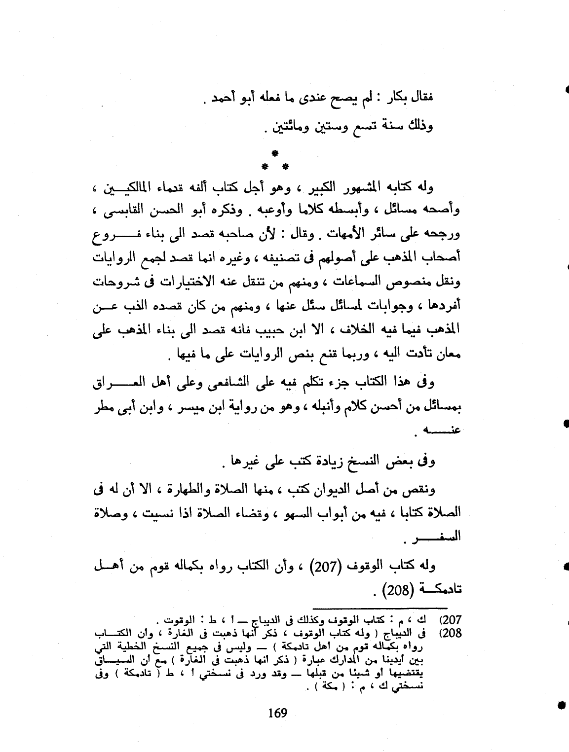 فقال البكار: لم يصح عندي ما فعله موسى أبو أحمد. وذلك سنة تسع ومائتين. وله كتابه المشهور الكبير، وهو أجل كتاب ألّفه قدماء المالكيين وأصحها مسائل، وأبسطها كلاماً، وأوعبها. وذكره أبو الحسن القابسي، ورجحه على سائر الأمهات، وقال: لأن صاحبه قصد الى بناء فروع أصحاب المذهب، على أصولهم، في تصنيفه، وغيره. إنما قصد بجمع الروايات ونقل مقصور السماعات ومنهم من نقل عنه الاختيارات في مشروحات أفردها، وجوابات لمسائل سئل عنها، ومنهم من كان قصده الذب عن المذهب، فيما فيه الخلاف، إلا ابن حبيب فإنه قصد الى بناء المذهب عن معان، تأدت إليه، وربما قنع بنص الروايات على ما فيها. وفي هذا الكتاب جدة تكلم وعلى أهل العراق بمسائل من أحسن كلام وأنبله، وهو من رواية ابن ميسر وابن أبي مضر، عنه. وفي بعض النسخ زيادة، كتب على غيرها، ونقص من أصل الديوان، كتب منها الصلاة والطهارة إلا أن له في الصلاة كتاب فيه، من أبواب السهو وقضاء الصلاة، إذا نسيت. وصلاة السفر، وله كتاب الوقوف وإن الكتاب رواه بكماله قوم من أهل مكة