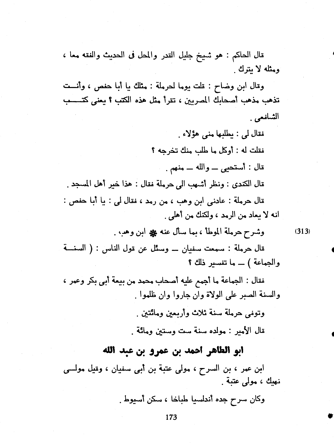 قال الحافظ الحاكم: هو شيخ جليل القدر والمحل، في الحديث والفقه معاً، ومثله لا يترك، وقال ابن وضاح: قلت يوماً لحرملة، مثله يا أبا حفصل مثلك، وأنت تذهب مذهب أصحابك المصريين، تقرأ مثل هذه الكتب، يعني كتب الشافعي، فقال لي: يطلبها مني هؤلاء. فقلت له: أوَكلما طلب منك تخرجه، قال: أستحي والله منهم، قال الكندي: ونظر أشهب الى حرملة، فقال: هذا خير أهل المسجد. قال حرملة: عادني ابن وهب من رمد بي، فقال: يا أبا حفصل إنه لا يعاد من الرمد، ولكنك من أهلي، وشرح حرملة الموطأ، فما سأل عنه ابن وهب قال حرملة: سمعت سفيان. وسئل عن قول الناس السنّة والجماعة، ما تفسير ذلك؟ فقال: الجماعة ما أجمع عليه أصحاب محمد، من بيعة أبي بكر، وعمر، والسنّة: الصبر على الولاة، وإن جاروا، وإن ظلموا. وتوفي حرملة سنة ثلاث وأربعين ومائتين. قال الأمير مولده سنة ستين ومائة.