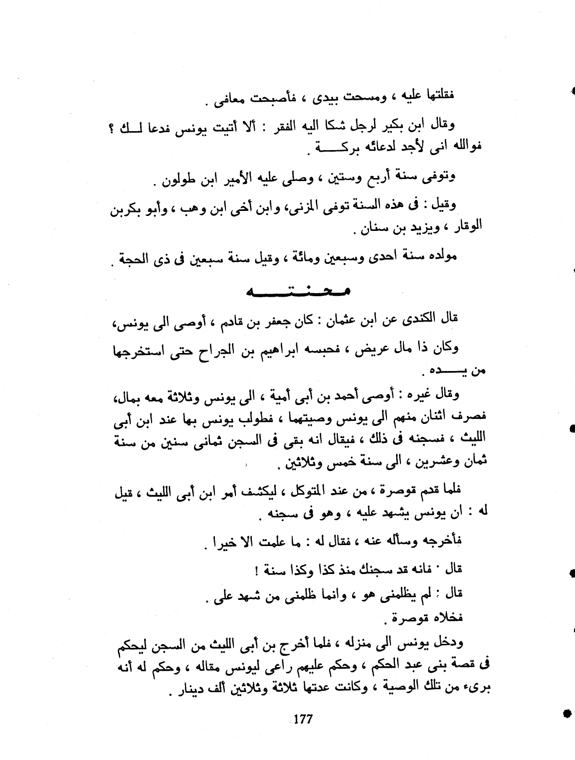 فقلتها عليه، ومسحت بيدي، فأصبحت معافاً. وقال ابن بكير لرجل شكا إليه الفقر: ألا أتيت يونس، فدعاك، فوالله إني لأجد له بركة وتوفي سنة أربع وستين. وصلى عليه الأمير ابن طولون. وقيل في هذه السنة توفي المزني وابن أخي ابن وهب، وأبي بكر بن الوقار، ويزيد بن سنان وتوفي سنة أربع وستين. مولده سنة إحدى وسبعين ومائة، وقيل سنة سبعين في ذي الحجة.