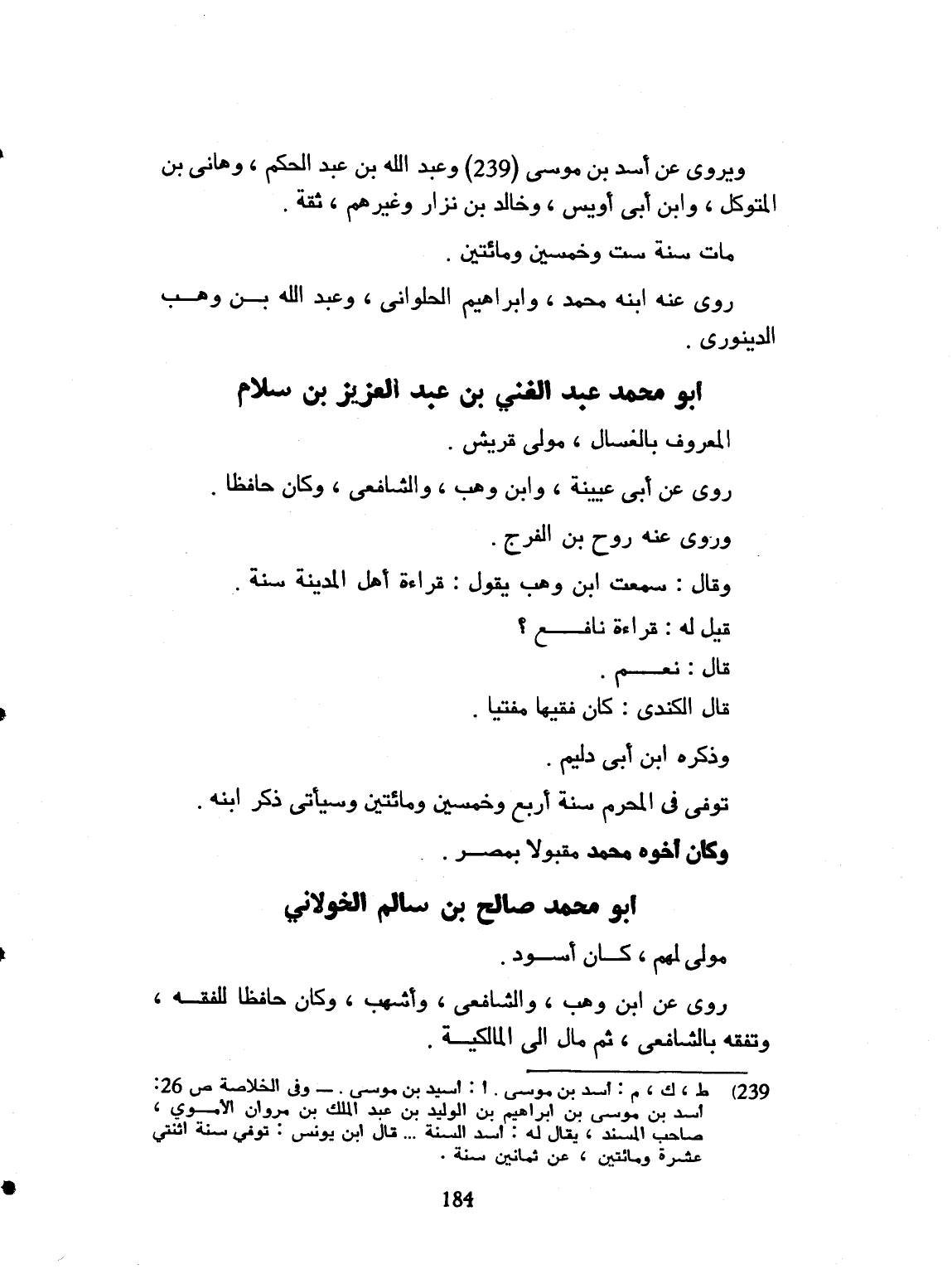 ويروي عن أسد بن موسى، وعبد الله بن عبد الحكم، وهاني بن المتوكل، وابن أبي أويس، وخالد بن نزار، وغيرهم، ثقة. مات سنة ست وخمسين ومائتين. روى عنه ابنه محمد وابراهيم الحلواني وعبد الله بن وهب الدينوري.
