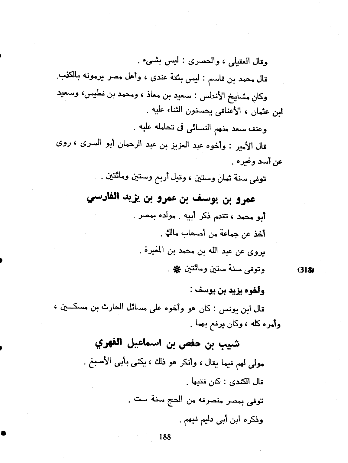 وقال العقيلي، والحصري: ليس بمشئ. وقال محمد بن قاسم: ليس بثقة عندي. وأهل مصر يرمونه بالكذب. وكان من مشائخ الأندلس سعد بن معاذ، ومحمد بن فطيس، وسعيد بن عثمان الاعناقي، يحسنون الثناء عليه. وعنف سعيد النسائي في تحامله عليه. قال الأمير، وأخوه عبد العزيز بن عبد الرحمن أبو السري روى عن أسد، وغيره. توفي سنة ثمان وستين وقيل أربع وستين ومائتين.