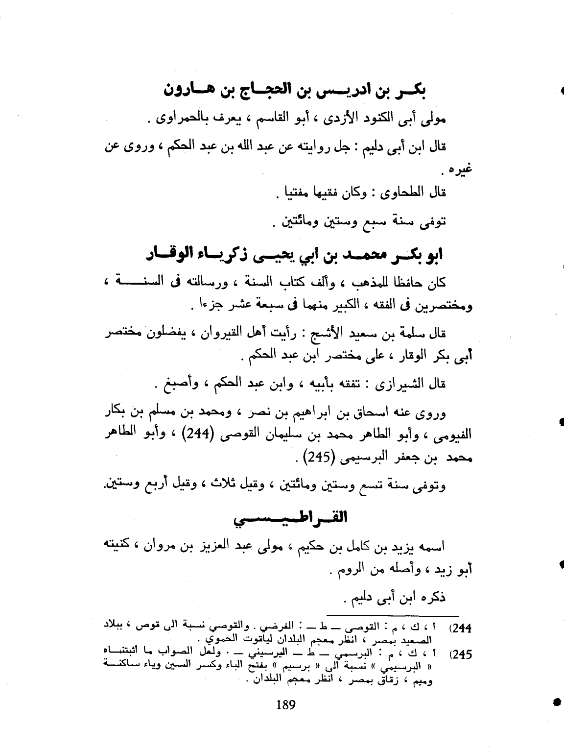 كان حافظاً للمذهب، وألف كتاب السنة، ورسالته في السنة، ومختصرين في الفقه، الكبير منهما في سبعة عشر جزءاً. قال سلمة بن سعيد الأشج: رأيت أهل القيروان، يفضلون مختصر أبي بكر الوقار، على مختصر ابن عبد الحكم. قال الشيرازي: تفقه بأبيه، وابن عبد الحكم، وأصبغ. روى عنه إسحاق بن نصر ومحمد بن مسلم بن بكار الفيومي، وأبو الطاهر محمد بن سليمان القوصي، وأبو الطاهر محمد بن جعفر البرسمي، وتوفي في رجب سنة تسع وستين ومائتين. وقيل ثلاث. وقيل أربع سنين.