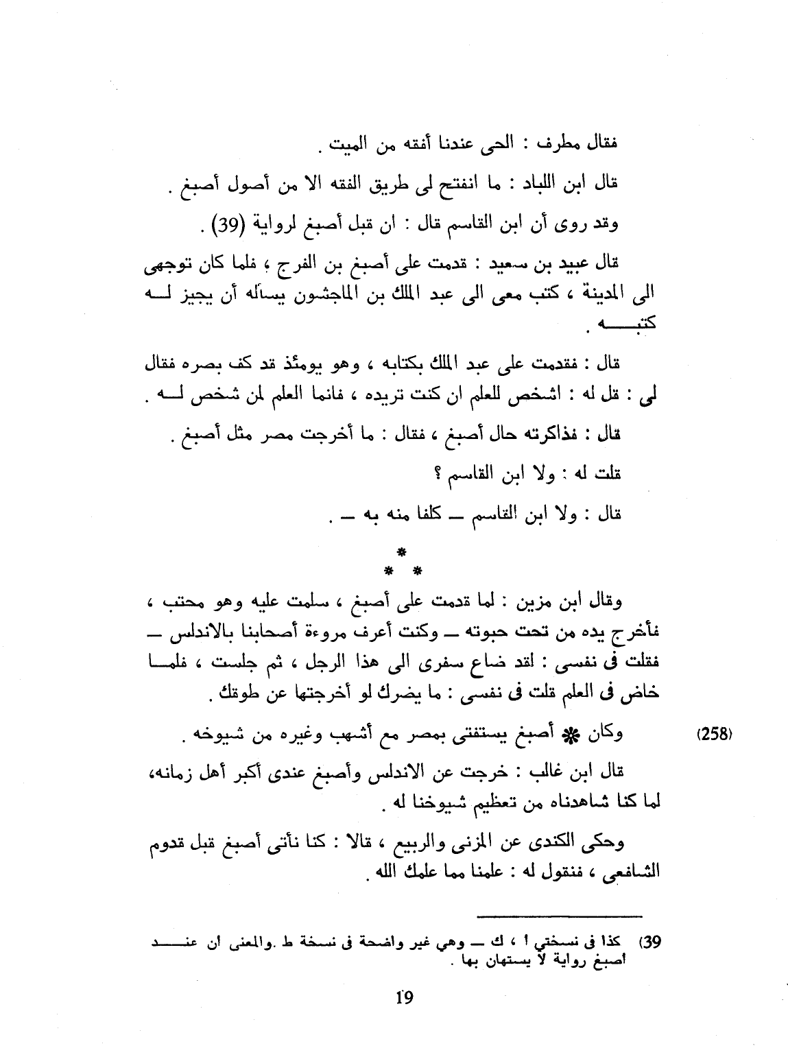 قال مطرف: الحي عندنا أفقه من الميت. قال ابن اللباد: ما انفتح لي طريق الفقه إلا من أصول أصبغ. وقد روي أن ابن القاسم قال: إن قيل أصبغ، سرُّوا به. قال عبيد بن سعيد: قدمت على أصبغ بن الفرج، فلما كان توجهي إلى المدينة، كتب معي إلى عبد الملك بن الماجشون يسأله أن يخير له كتبه. قال: فقدمت على عبد الملك بكتابه، وهو يومئذ قد كف بصره، فقال لي: قل له: اشخص للعلم إن كنت تريده فإن العلم لمن شخص له. قال: فذاكرته، حال أصبغ. قال ما أخرجت مصر مثل أصبغ. قلت له: ولا ابن القاسم؟ قال: ولا ابن القاسم، كلفاً منه به. وقال ابن مزين فلما قدمت على أصبغ سلمت عليه، وهو محتب فأخرج يده من تحت حبوته، وكنت أعرف مروءة أصحابنا بالأندلس، فقلت في نفسي: ما يضرك لو أخرجتها عن طوقك. وكان أصبغ بمصر يستفتي مع أشهب وغيره، من شيوخه. قال ابن غالب: خرجت من الأندلس، وأصبغ عندي أكبر أهل زمانه: لما كنا شاهدناه من تعظيم شيوخنا له. وحكى الكندي عن المزني والربيع قال: كنا نأتي أصبغ قبل قدوم الشافعي، فقلنا له: علمنا مما علمك الله.