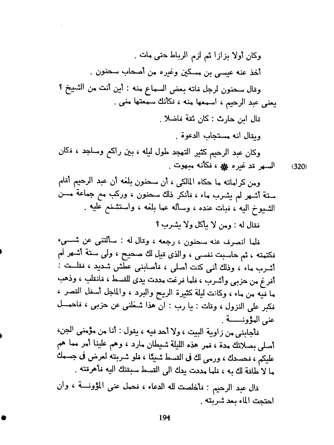 وكان أولاً بزازاً. ثم لزم الرباط، حتى مات. أخذ عنه عيسى، وٌيره من أصحاب سحنون. وقال سحنون لرجل فاته بعض السماع منه: أين أنت من الشيخ؟ يعني عبد الرحيم أسمعها منه، فكأنك سمعت مني. قال ابن حارث: كان ثقة فاضلاً. ويقال إنه مستجاب الدعوة. كان عبد الرحيم كثير التهجد، طول ليله بين راكع وساجد، فكان السهر قد غيره، كأنه مبهوت. ومن كراماته ما حكاه المالكي: أن سحنون بلغه أن عبد الرحيم أقام ستة أشهر، لم يشرب ماءً، فأنكر ذلك سحنون. وركب مع جماعته من الشيوخ إليه فبات عنده وسأله عما بلغه، واستشفع عليه. فقال: ومن يأكل ولا يشرب؟ فلما انصرف عنه سحنون، رجعه، وقال له: سألتني عن شيء، فكتمته. ثم حاسبت نفسي. والذي قيل لك صحيح. ولي ستة أشهر، لم أشرب ماءً. وذلك أني كنت أصلي، فأصابني عطش شديد، فقلت افرغ من حزبك واشرب. فلما فرغت مددت يدي الى القسط، فانقلب، وذهب ما فيه من ماء. وكانت ليلة كثيرة الريح والبرد، والماجل أسفل القصر، فكبر علي النزول. وقلت: يا رب إن هذا أشغلني عن حزبي. فاحمل عني المؤونة. فأجابني من زاوية البيت، ولا أحد فيه، يقول: أنا من مؤمن الجن. أصلي بصلاتك، مدة. فمر هذه الليلة شيطان مارد، وهم علينا أضرّ مما هم عليكم، فحسدك ورمى لك في القسط شيئاً. فلو شربته لعرض في جسمك ما لا طاقة لك به. فلما مددت يدك الى القسط، سبقتك إليه، وأهرقته. قال عبد الرحيم: فأخلصت لله الدعاء، فحمل عني المؤونة. وإن احتجت الماء بعدُ شربتُه.