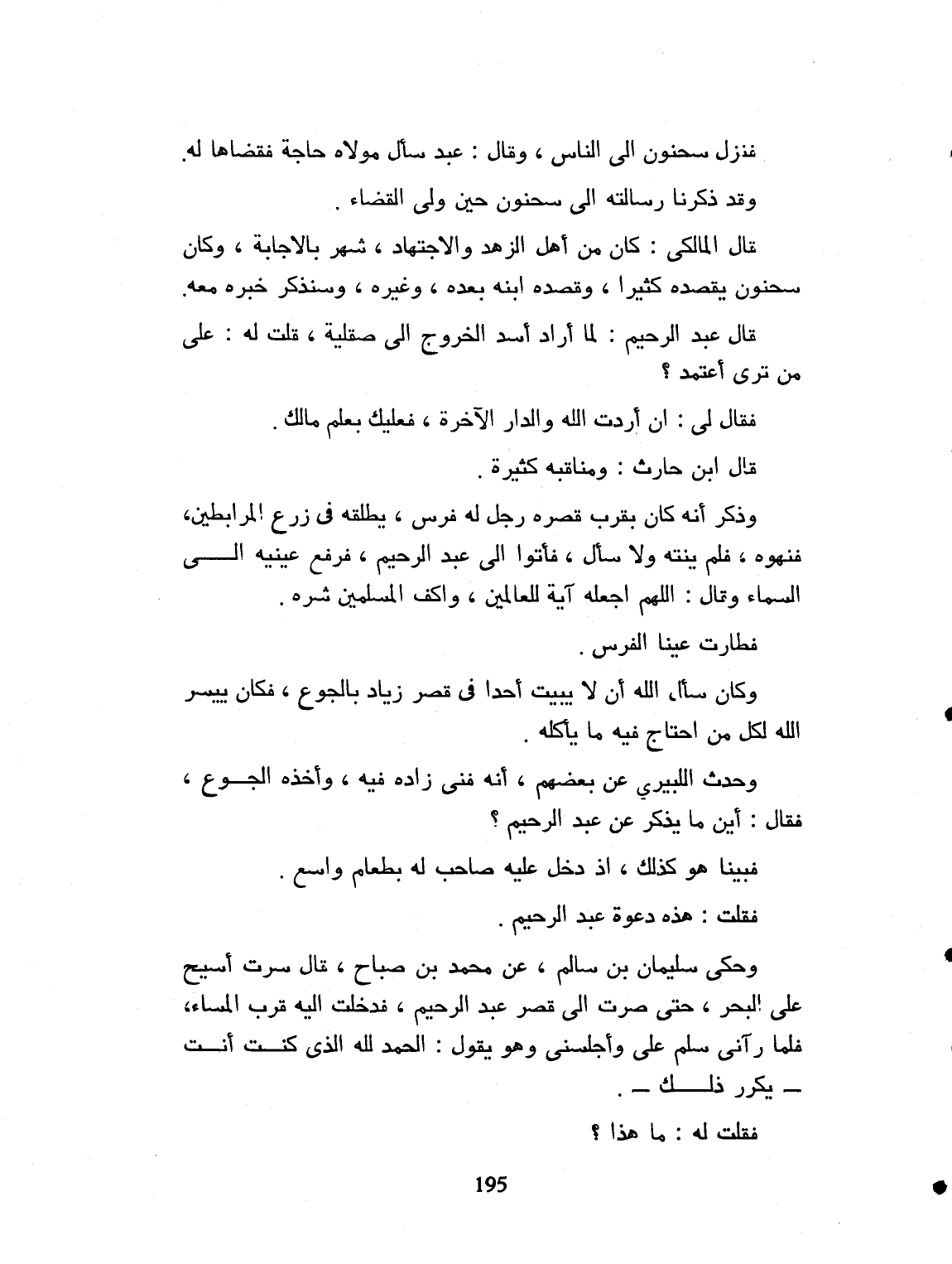 فنزل سحنون الى الناس وقال: عبد الرحيم سأل مولاه حاجته، فقضاها له. وقد ذكرنا رسالته الى سحنون وقد ولي القضاء. قال المالكي: كان من أهل الزهد والاجتهاد. شهر بالإجابة. وكان سحنون يقصده كثيراً. وقصد ابنه بعده. وسنذكر خبره معه. قال عبد الرحيم: لما أراد الخروج الى صقلية، قلت له: على من ترى أعتمد؟ فقال لي: إن أردت الله والدار الآخرة، فعليك بعلم مالك. قال ابن حارث: ومناقبه كثيرة. وذكر أنه كان بقرب قصره، رجل له فرس يطلقه في زرع المرابطيين. فنهوه فلم ينته. فأتوا الى عبد الرحيم، فرفع عينيه الى السماء وقال: اللهم اجعله آية للمسلمين، واكف المسلمين شره. فطارت عين الفرس. وكان سأل الله أن لا يبيت أحداً في قصر زياد بالجوع. فكان بيسر الله لكل من احتاج فيه، ما يأكله. وحدث اللبيدي، عن بعضهم، أنه فني زاده فيه. وأخذه الجوع، فقال: أين ما يذكر عن عبد الرحيم؟ فبينما هو كذلك، إذ دخل عليه صاحب له بطعام واسع، فقلت هذه دعوة عبد الرحيم. وذكر سليمان بن سالم عن محمد بن صباح، قال: سرت أسبح على البحر حتى صرت الى قصر عبد الرحيم، فدخلت إليه، قرب الماء. فلما رآني سلم عليّ، وأجلسني وهو يقول: الحمد لله الذي كنت أنت. فكرر ذلك. فقلت له: ما هذا؟