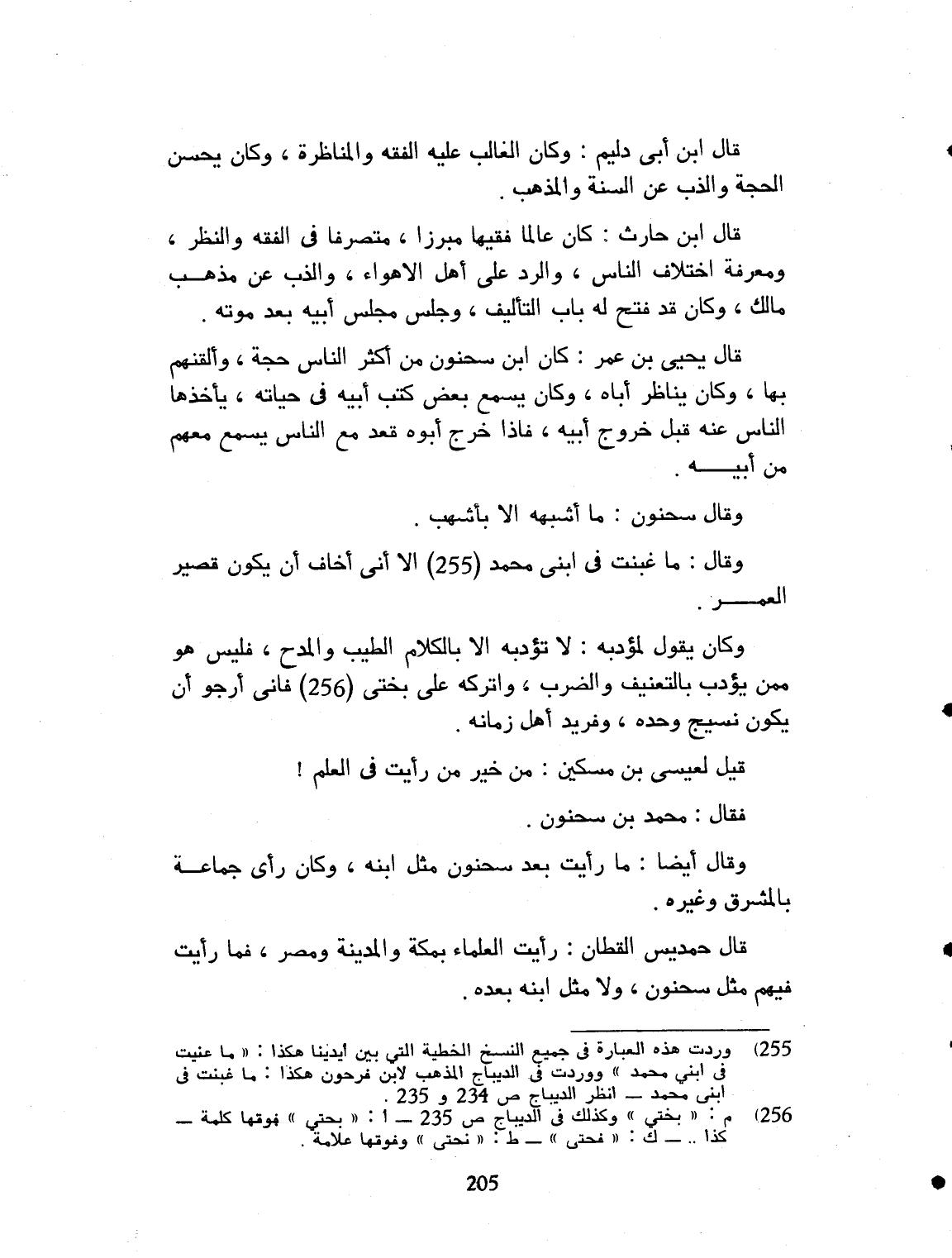 قال ابن أبي دليم: وكان الغالب عليه الفقه، والمناظرة. وكان يحسن الحجة والذب عن السنة، والمذهب. قال ابن حارث: كان عالماً فقيهاً مبرزاً، منصرفاً في الفقه والنظر ومعرفة اختلاف الناس، والرد على أهل الأهواء، والذب عن مذهب مالك. وكان قد فتح له باب التأليف، وجلس مجلس أبيه بعد موته، قال يحيى بن عمر: كان ابن سحنون من أكثر الناس حجة، وأتقنهم بها، وكان يناظر أباه. وكان يسمع بعض كتب أبيه في حياته، يأخذها الناس عنه قبل خروج أبيه. فإذا خرج أبوه، قعد مع الناس يسمع معهم من أبيه. وقال سحنون: ما أشبهه إلا بأشهب. وقال: ما غبنت في ابني محمد، إلا أني أخاف أن يكون عمره قصيراً. وكان يقول لمؤدبه: لا تؤدبه إلا بالكلام الطيب، والمدح. فليس هو ممن يؤدب بالتعنيف والضرب، واتركه على بختي، فإني أرجو أن يكون إمام وقته، وفريد أهل زمانه. قيل لعيسى بن مسكين: من رأيت في العلم؟ فقال: محمد بن سحنون. وقال أيضاً: ما رأيت بعد سحنون مثل ابنه. وكان رأى جماعة بالمشرق وغيره. قال حمديس القطان: رأيت العلماء بمكة والمدينة ومصر، فما رأيت فيهم مثل سحنون ولا مثل ابنه بعده.