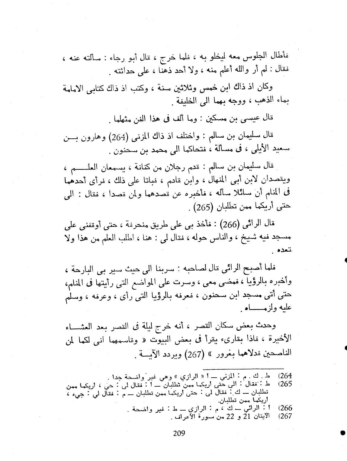فأطال الجلوس معه، ليخلو به. فلما خرج أبو رجاء، سألته عنه فقال: لم أرَ والله أعلم منه، ولا أحدّ ذهناً، على حداثته. ووجه به الى الخليفة. قال عيسى بن مسكين: وما ألف في هذا الفن مثله. قال سليمان بن سالم: واختلف إذ ذاك وهارون بن سعيد الايلي، في مسألة، فتحاكما الى محمد بن سحنون. قال سليمان بن سالم: قدم رجلان من بني كنانة، ليسمعا العلم. ويقصدا ابن أبي المنهال وابن قادم، فيأتيا على ذلك. فرأى أحدهما في المنام أن سائلاً سأله، فأخبره عن قصدهما، ولمن قصدا. فقال لمن قصدكما، من تطلبان؟ قال الرائي فأخذني على طريق منحرفة، حتى أوقفني على مسجد فيه شيخ، والناس حوله. فقال لي: هنا اطلب من العلم من هذا، ولا تعدل. فلما أصبح الرائي قال لصاحبه: سر بنا الى حيث سير بي البارحة. وأخبره بالرؤيا. فمضى معي. وسرت الى الموضع الذي رأيته في المنام. حتى مسجد ابن سحنون، فعرفه بالرؤيا التي رأى، وعرفه، وسلم عليه، ولزمه. حكى بعض سكان القصر: أنه خرج ليلة في القصر بعد العشاء الآخرة. فإذا بقارئ يقرأ في بعض البيوت، وقاسمَهما إني لكما لمنَ النّاصحين. فدلاهُما بغُرور. ويردد الآية.