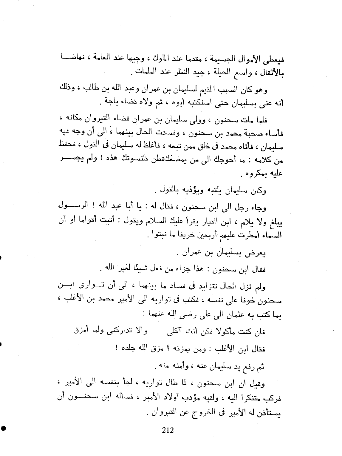 فقال ابن الأغلب: ومن يمزقه، مزق الله جلده. ثم رفع يد سليمان عنه، وأمنه منه. وقيل إن ابن سحنون لما طال ترقيه، لما ينفعه من الأمير، ركب متنكراً إليه. ولقيه مؤدب أولاد الأمير
