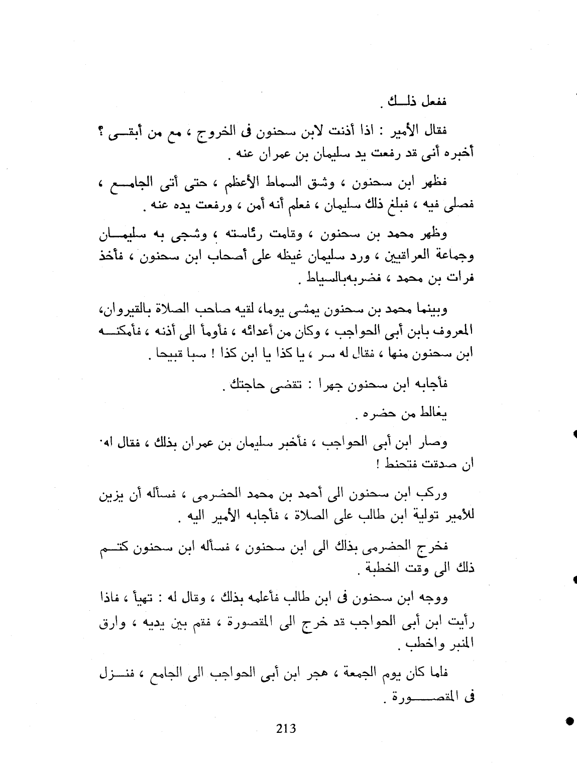 إذا أذنت لابن سحنون في الخروج، مع من أبقى؟ أخبره: إني قد رفعت يد سليمان بن عمران عنه. فظهر ابن سحنون وشق السماط الأعظم، حتى أتى الجامع، فصلى فيه. فبلغ ذلك سليمان فعلم أنه أمن، ورفعت يده عنه. وظهر محمد بن سحنون، وقامت رئاسته. وشجي به سليمان وجماعة العراقيين، ورد سليمان غضبه على أصحاب ابن سحنون. فأخذ فرات بن محمد فضربه بالسياط. وبينما محمد بن سحنون يمشي يوماً، لقيه صاحب الصلاة بالقيروان، المعروف بابن أبي الحواجب، وكان من أعدائه. فأومأ الى أذنه فأمكنه ابن سحنون منها. فقال له سراً: يا كذا ابن كذا نسباً قبيحاً - فأجابه ابن سحنون جهراً: تُقْضى حاجتك. يغالط من حضره. وسار ابن أبي الحواجب فأخبر سليمان بن عمران بذلك. فقال إن صدقت فتحفظ. وركب ابن سحنون الى أحمد بن محمد الحضرمي، فسأله أن يزين للأمير تولية ابن طالب على الصلاة. فأجابه الأمير إليه. فخرج الحضرمي بذلك الى ابن سحنون فسأله ابن سحنون كتم ذلك الى وقت الخطبة. ووجه ابن سحنون في طلب ابن طالب، فأعلمه بذلك. وقال له: تهيأ. فإذا رأيت ابن أبي الحواجب قد خرج الى المقصورة، فقم بين يديه، وارق المنبر، واخطب. فلما كان يوم الجمعة، هجِر ابن أبي الحواجب الى الجامع، فنزل في المقصورة،