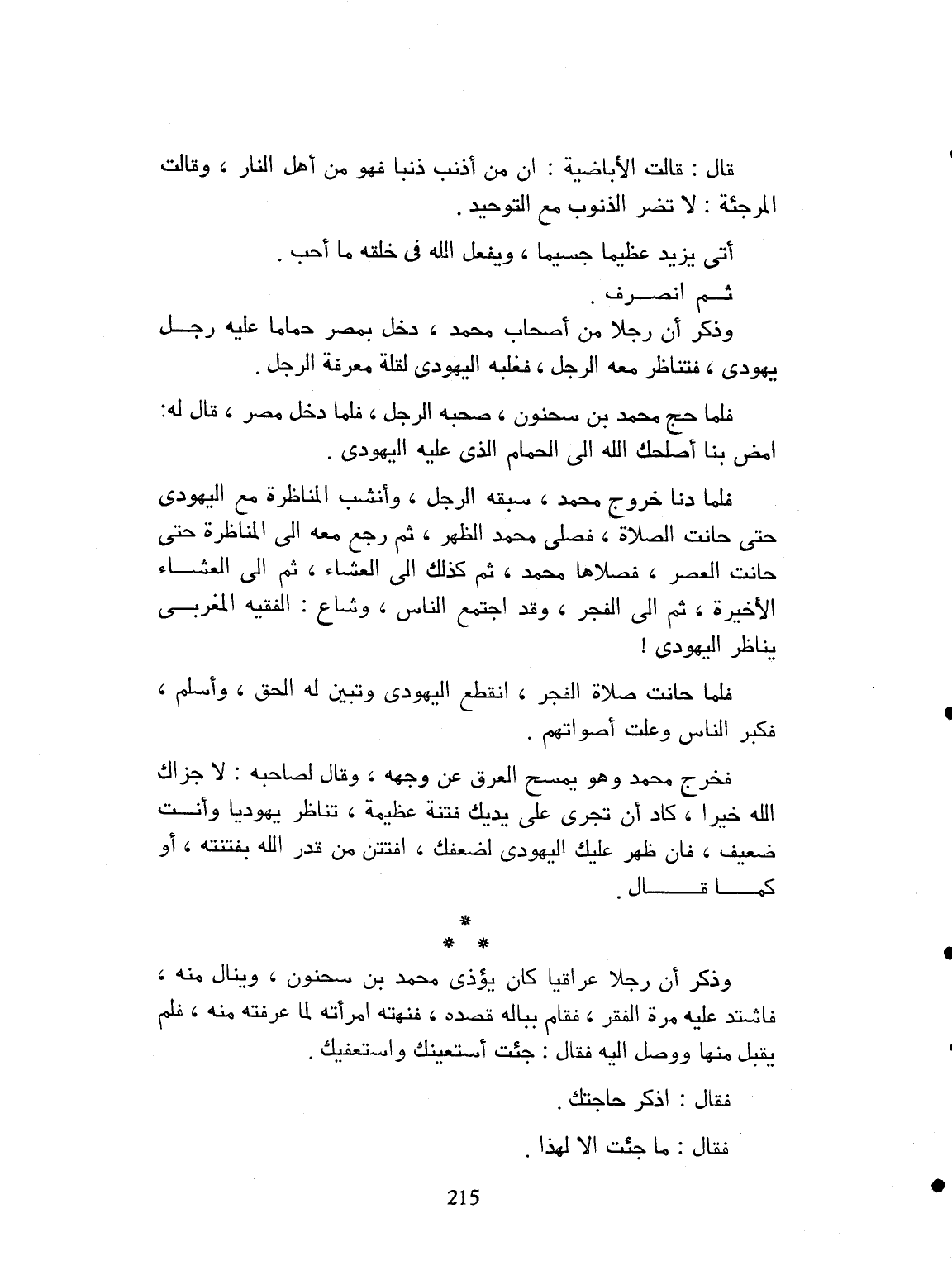 قال: قالت الإباضية: إن من أذنب ذنباً فهو من أهل النار. وقالت المرجئة: لا تضر الذنوب مع التوحيد. أما يزيد عظيماً جسيماً، ويفعل الله في خلقه ما أحب. ثم انصرف. وذكر أن رجلاً من أصحاب محمد، دخل بمصر، حماماً، عليه رجل يهودي فتناظر معه الرجل فغلبه اليهودي، لقلة معرفة الرجل. فلما حج محمد بن سحنون صحبه الرجل، فلما دخل مصر، قال له: امض بنا، أصلحك الله، الى الحمام الذي عليه اليهودي. فلما دنا خروج محمد، سبقه الرجل. وأنشب المناظرة مع اليهودي، حتى حانت الصلاة. فصلى محمد الظهر، ثم رجع معه الى المناظرة، حتى كانت العصر، فصلاها. ثم كذلك العشاء، ثم الى العشاء الآخرة، ثم الى الفجر، وقد اجتمع الناس وشاع الخبر بمصر، الفقيه المغربي يناظر اليهودي، فلما كانت صلاة الفجر انقطع اليهودي، وتبين له الحق وأسلم. فكبّر الناس وعلت أصواتهم. فخرج محمد وهو يمسح العرق عن وجهه، وقال لصاحبه: لا جزاك الله خيراً. كاد أن يجري على يديك فتنة عظيمة. تناظر يهودياً، وأنت بضعف، فإن ظهر عليك اليهودي، لضعفك، افتتن من قدر الله فتنته، أو كما قال. وذكر أن رجلاً عراقياً كان يؤذي محمد بن سحنون، وينال منه. فاشتد عليه مرة الفقر، فقام بباله قصده. فنهته امرأته لما عرفت منه، فلم يقبل منها. ووصل إليه. فقال: جئت