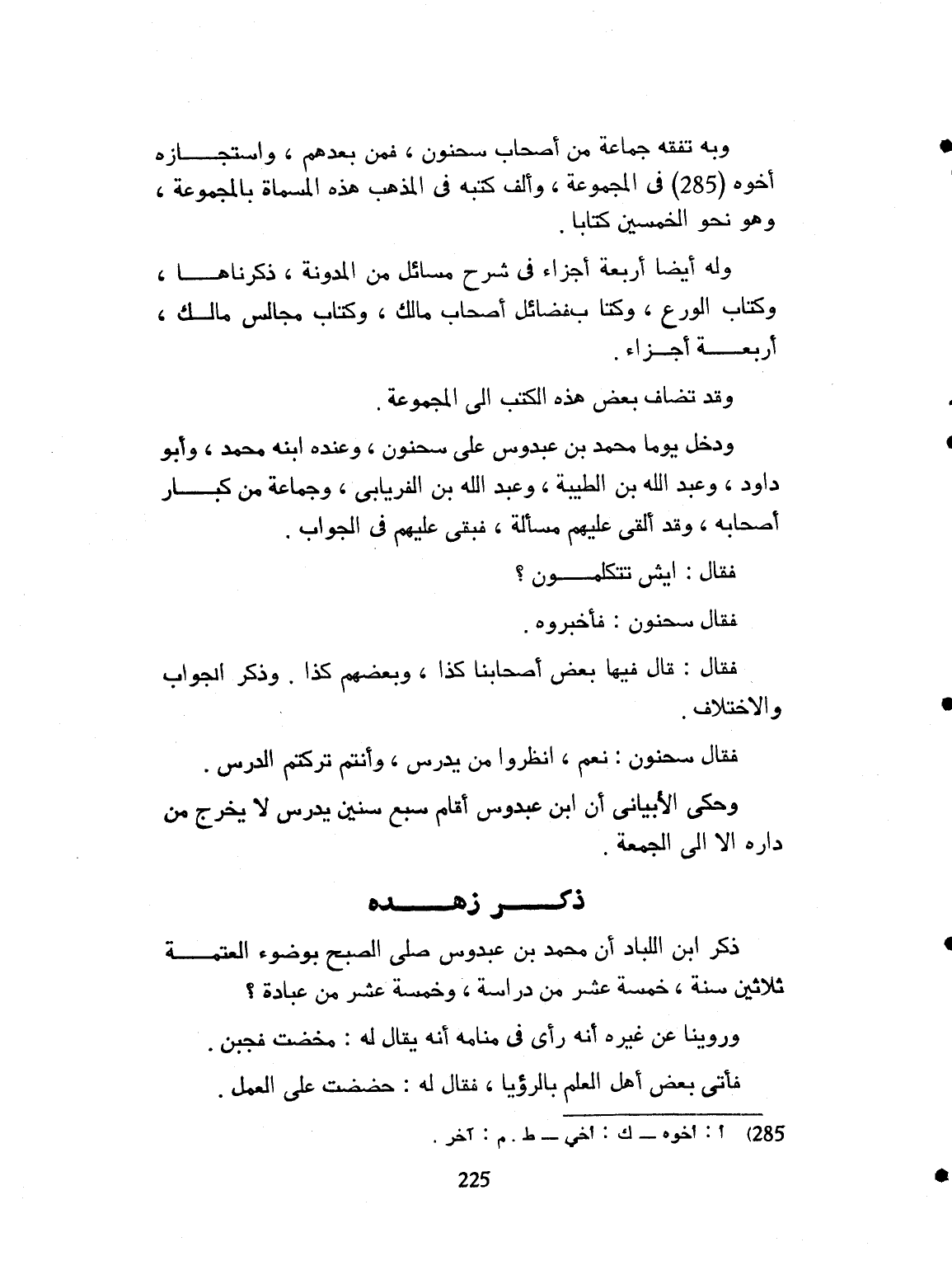 وبه تفقه جماعة من أصحاب سحنون، فمن بعدهم. واستجازه آخر في المجموعة. وألف كتبه هذه في المذهب المسماة بالمجموعة. وهي نحو الخمسين كتاباً. وله أيضاً أربعة أجزاء في شرح مسائل من المدونة. ذكرناها. وكتاب الورع، وكتاب فضائل أصحاب مالك. وكتاب مجالس مالك، أربعة أجزاء. وقد تضاف بعض هذه الكتب الى المجموعة. ودخل يوماً محمد بن عبدوس على سحنون وعنده ابنه محمد، وأبو داود، وعبد الله بن الطبية، وعبد الله بن سهل القبرياني، وجماعة من كبار أصحابه. وقد ألقى عليهم مسألة، فبقي عليهم في الجواب. فقال إيش يتكلمون؟ فقال سحنون، فأخبِروه. فقال: قال فيها بعض أصحابنا كذا. وبعضهم كذا. وذكر الجواب والاختلاف. فقال سحنون: نعم. انظروا من يدرس وأنتم تركتم الدرس. وحكى الإيمالي أن ابن عبدوس أقام سبع سنين يدرس، لا يخرج من داره إلا الى الجمعة.