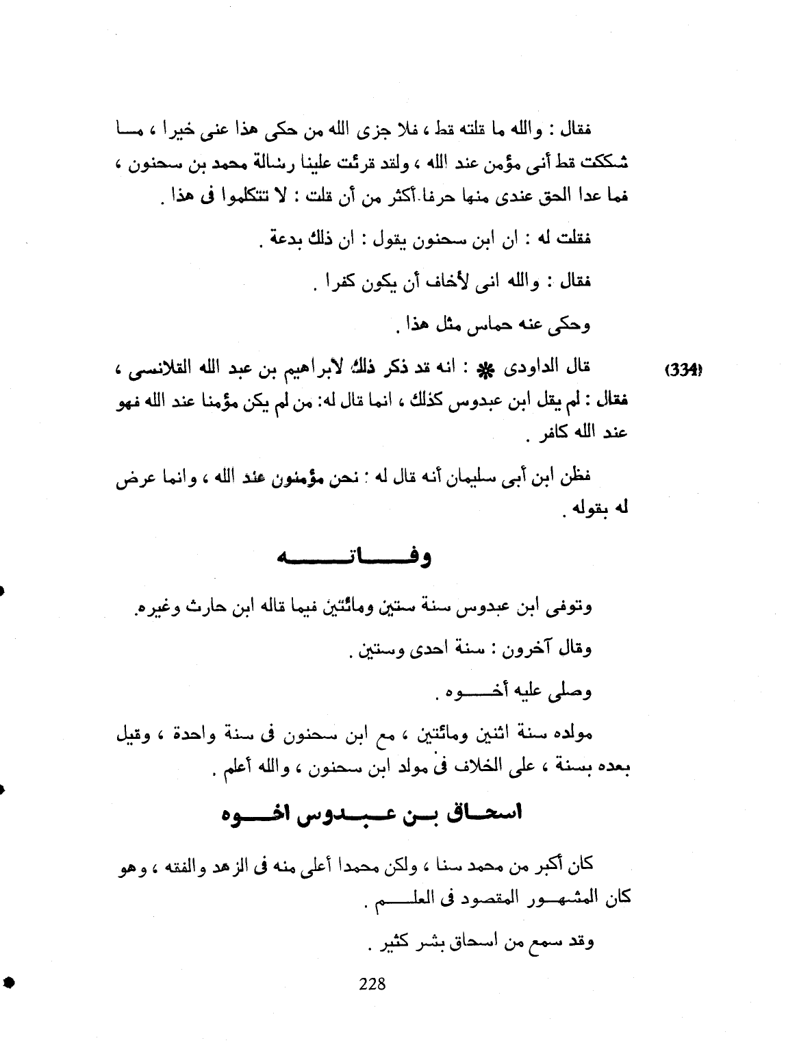 فقال: والله ما قلته قط. فلا جزى الله من حكى هذا عني خيراً. ما شككت قط أني مؤمن عند الله. ولقد مرت علينا. وسأله محمد بن سحنون فما عدا الحق عندي منها حرفاً أكثر مما قلت: لا تتكلموا في هذا. فقلت له: إن ابن سحنون يقول: ذلك بدعة. فقال: والله إني لأخاف أن يكون كفراً. وحكى عنه حماس مثل هذا. قال الداودي: إنه ذكر ذلك لابراهيم بن عبد الله القلانسي، فقال: لم يقل ابن عبدوس كذا. إنما قال: من لم يكن مؤمناً عند الله، فهو عند الله كافر. فظن أن ابن أبي سلمة أنه قال له: نحن مؤمنون عند الله. وإنما عرض له بقوله.
