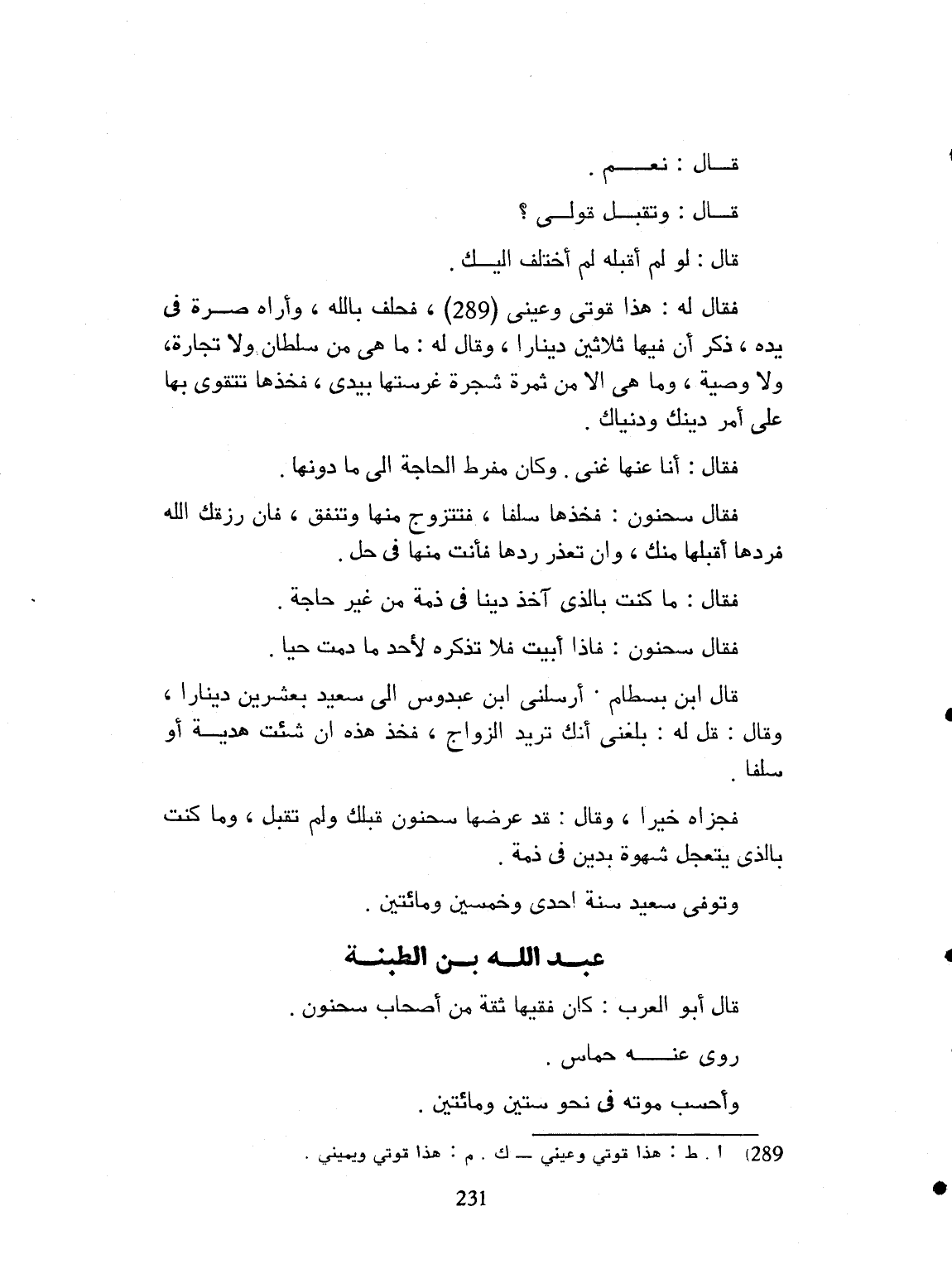 قال: نعم. قال: وتقبل قولي؟ فقال: نعم. لو لم أقبله لم أختلف إليك. فقال له: هذا قولي، ويميني. فحلف بالله وأراه صرة في يده. ذكر أن فيها ثلاثين ديناراً. وقال له: ما هي من سلطان، ولا من تجارة، ولا وصية. وما هي إلا من ثمرة شجرة غرستها بيدي، فخذها، تتقوى بها على أمر دينك ودنياك. فقال: أنا عنها غني. وكان مفرط الحاجة الى ما دونها. فقال سحنون: خذها سلفاً، فتتزوج منها، وتنفق. فإن رزقك الله ردها أقبلها منك. فإن تعذر ردها فأنت منها في حل. فقال: ما كنت بالذي آخذ ديناً في ذمتي من غير حاجة. فقال سحنون: فإذا أبيت فلا تذكره لأحد ما دمت حياً. قال ابن بسطام: أرسلني ابن عبدوس الى سعيد بعشرين ديناراً. وقال قل له: بلغني أنك تريد الزواج، فخذ هذه إن شئت هدية، أو سلفاً. فجزاه خيراً، وقال: قد عرضها سحنون قبله، ولم نقبل. ولا كنت بالذي يتعجل شهوة بدَين في ذمته. وتوفي سعيد سنة إحدى وخمسين ومائتين.