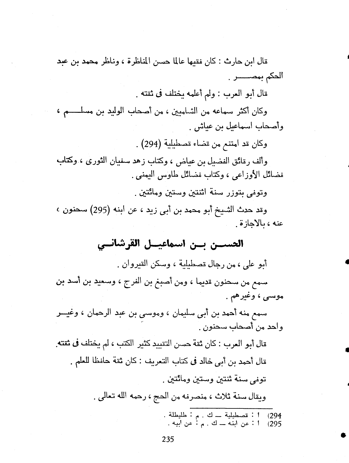 أبو علي: من رجال قصطلية، وسكن القيروان. سمع من سحنون قديماً، ومن أصبغ بن الفرج، وسعيد بن أسد بن موسى، وغيرهم. سمع منه أحمد بن أبي سليمان، وموسى بن عبد الرحمن، وغير واحد من أصحاب سحنون. قال أبو العرب: كان ثقة، حسن التقييد، يسير الكتب، لم يختلف في ثقته. قال أحمد بن خالد في كتاب التعريف: كان ثقة، حافظاً للعلم. توفي سنة اثنتين وستين ومائتين. ويقال سنة ثلاث منصرفه من الحج.