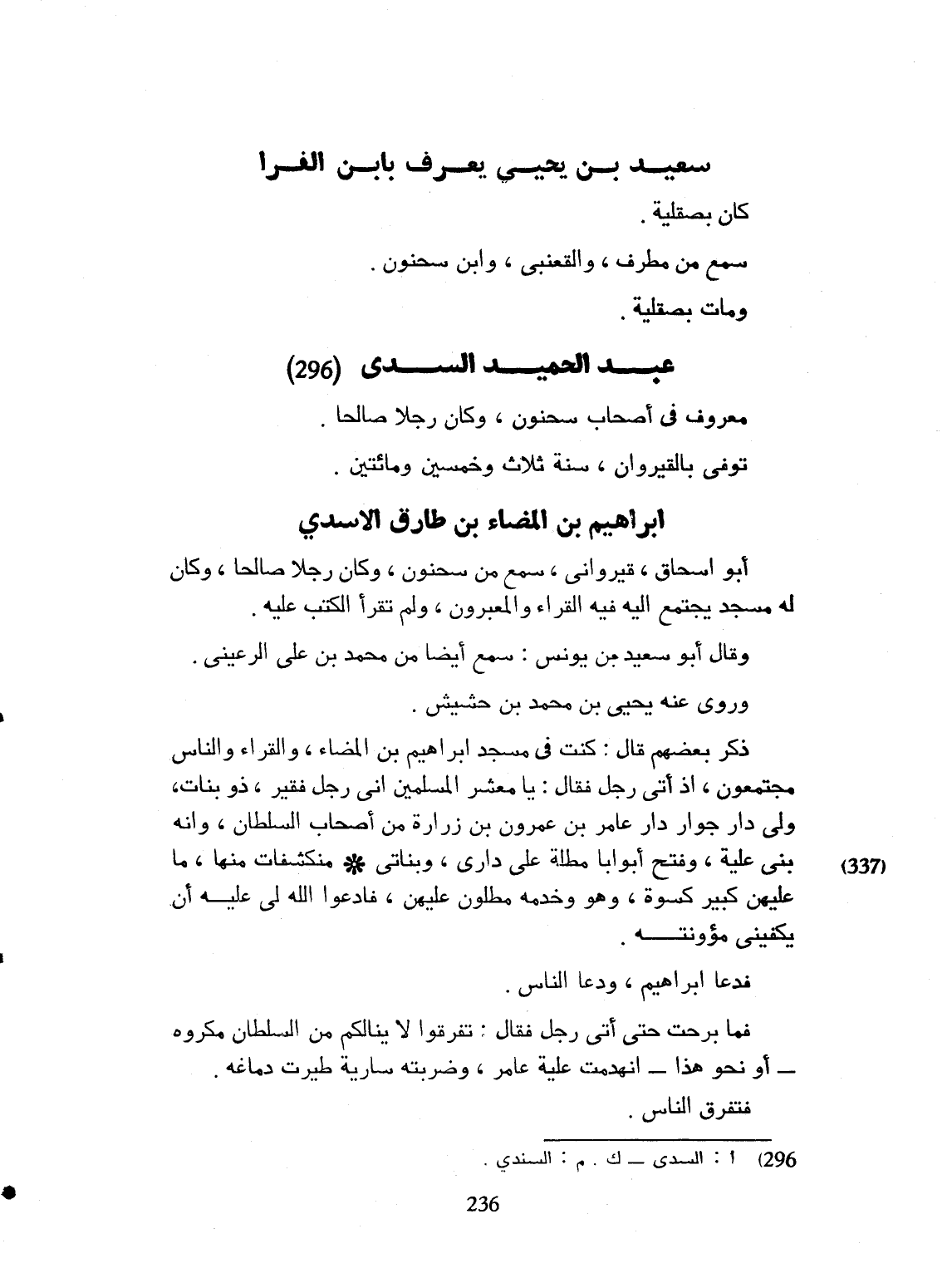 أبو إسحاق. قيرواني، سمع من سحنون. وكان رجلاً صالحاً. وكان له مسجد يجتمع إليه فيه القراء والمعبرون. ولم يقرأ الكتاب عليه. وقال أبو سعيد بن يونس: سمع أيضاً من محمد بن علي الرعيني. وروى عنه يحيى بن محمد حشيش. ذكر بعضهم، قال: كنت في مسجد ابراهيم بن المضاء والقراء والناس مجتمعون، إذ أتى رجل، فقال: يا معشر المسلمين. أنا رجل فقير، ذو بنات، ولي دار جوار عامر بن عمرون بن زرارة، من أصحاب السلطان، وأنه بنى عليه، وفتح أبواباً مطلة على داري، وبناتي منكشفات منها. ما عليهن كبير كسوة. وهو وخدمه مطلون عليهن. فادعوا الله لي عليه أن يكفيني مؤنته. فدعا ابراهيم ودعا الناس، فما برحت حتى أتى رجل، فقال: تفرّقوا لا ينالكم من السلطان مكروه، أو نحو هذا، هدمت عليّة عامر، وضربته سارية، طيرت دماغه، فافترق الناس،