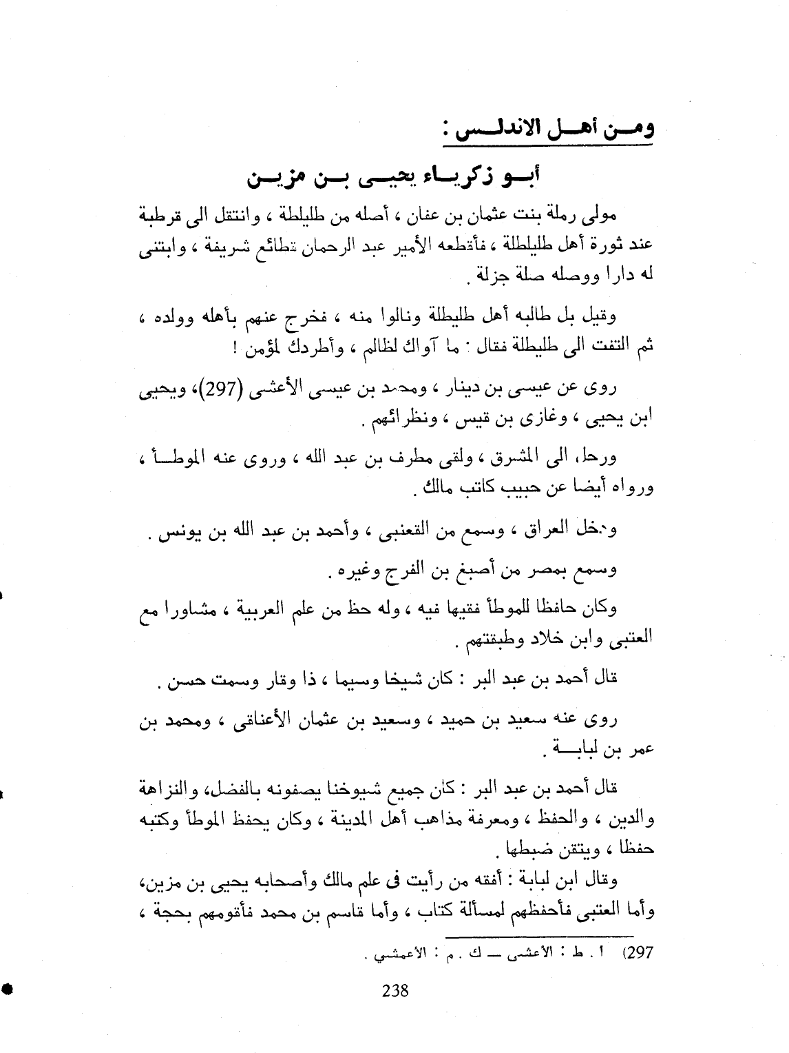 مولى رملة ابنة عثمان بن عفان. أصله من طليطلة. وانتقل الى قرطبة عند ثورة أهل طليطلة. فأقطعه الأمير عبد الرحمن قطائع شريفة، وابتنى له داراً، ووصله صلة جزلة. وقيل: بل طالبه أهل طليطلة، وقال ما أقراك لظالم، وأطردك لمؤمن. روى عن عيسى بن دينار، ومحمد بن عيسى الأعشى، ويحيى بن يحيى، وغازي بن قيس، ونظرائهم. ورحل الى المشرق. ولقي مطرف بن عبد الله، وروى عنه الموطأ. ورواه أيضاً عن حبيب كاتب مالك. ودخل العراق وسمع من القعنبي، وأحمد بن عبد الله بن يونس. وسمع بمصر من أصبغ بن الفرج، وغيره. وكان حافظاً للموطأ، فقيهاً فيه، وله حظ من علم العربية، مشاوراً مع العتبي وابن خالد، وطبقتهم. قال أحمد بن عبد البر: كان شيخنا وسماً ذا وقار، وسمت حسن. روى عنه سعيد بن حميد، وسعيد بن عثمان الأعناقي، ومحمد بن عمر بن لبابة. قال أحمد بن عبد البر: كان جميع شيوخنا يصفونه بالفضل، والنزاهة، والدين، والحفظ، ومعرفة مذهب أهل المدينة. وكان يحفظ الموطأ، وكتبه، حفظاً، ويتقن ضبطها. وقال ابن لبابة: أفقه من رأيت في علم مالك، وأصحابه، يحيى بن مزين. وأما العتبي فأحفظهم بمسألة كتاب. وأما قاسم بن محمد فأقومهم بحجة،