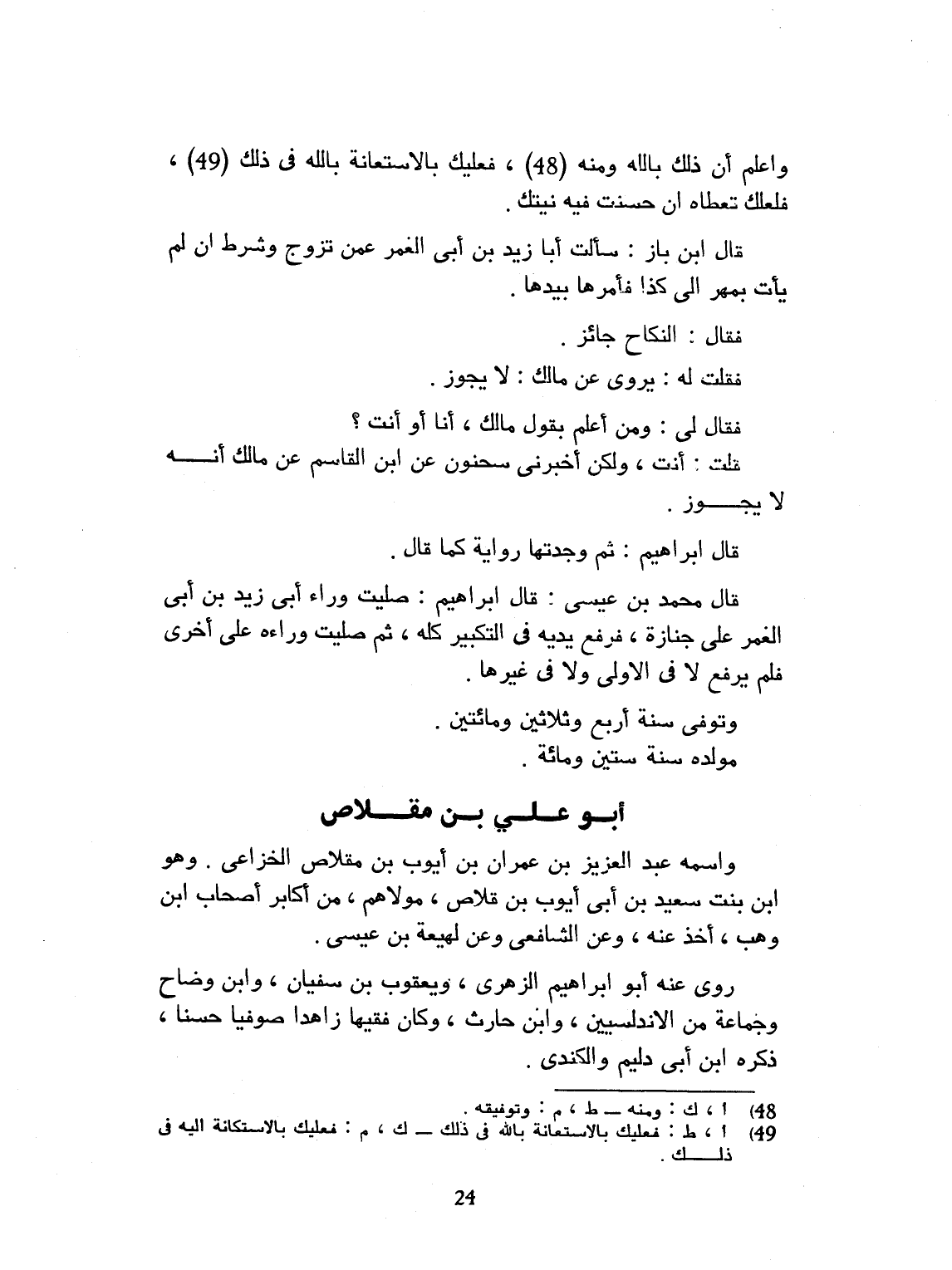 وأعلم أن ذلك بالله ومنه، فعليك بالإستكانة إليه في ذلك. فلعلك تعطاه إن حسنت فيه نيّتك. قال ابن باز: سألت. أبا زيد ابن أبي الغمر، عمّن تزّوج وبشرط أنه إن لم يأت بمهر إلى كذا، فأمرها بيدها. فقال النكاح حائز فقلت له يُروى عن مالك، لا يجوز. فقال لي ومن أعلم بقول مالك؟ أنا أو أنت؟ قلت: أنت. ولكن أخبرني سحنون عن ابن القاسم عن مالك: إنه لا يجوز: قال إبراهيم ثم وجدتها رواية كما قال محمد بن عيسى.