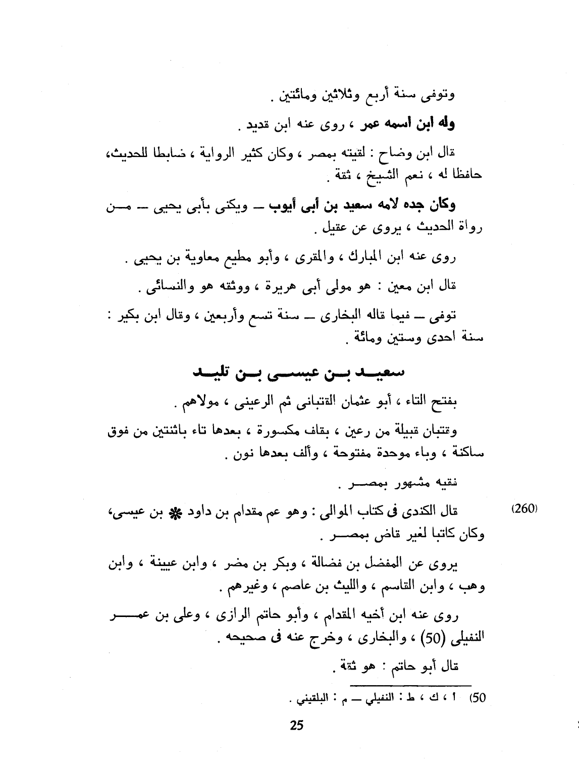وتوفي سنة أربع وثلاثين ومائتين. وله ابن اسمه محمد روى عنه ابن جرير قال ابن وضاح: لقيته بمصر، وكان كثير الرواية ضابطاً للحديث حافظاً له، نعم الشيخ ثقة. وكان جده لأمه سعيد بن أبي أيوب يكنى بأبي يحيى من رواة الحديث. يروي عن عقيل. روى عنه ابن المبارك والمقري، وأبو مطيع معاوية بن يحيى. قال ابن معين: هو مولى أبي هريرة، وثّقه هو والنسائي. توفي فيما قاله البخاري، سنة تسع وأربعين. وقال ابن بكير: سنة إحدى وستين ومائة.