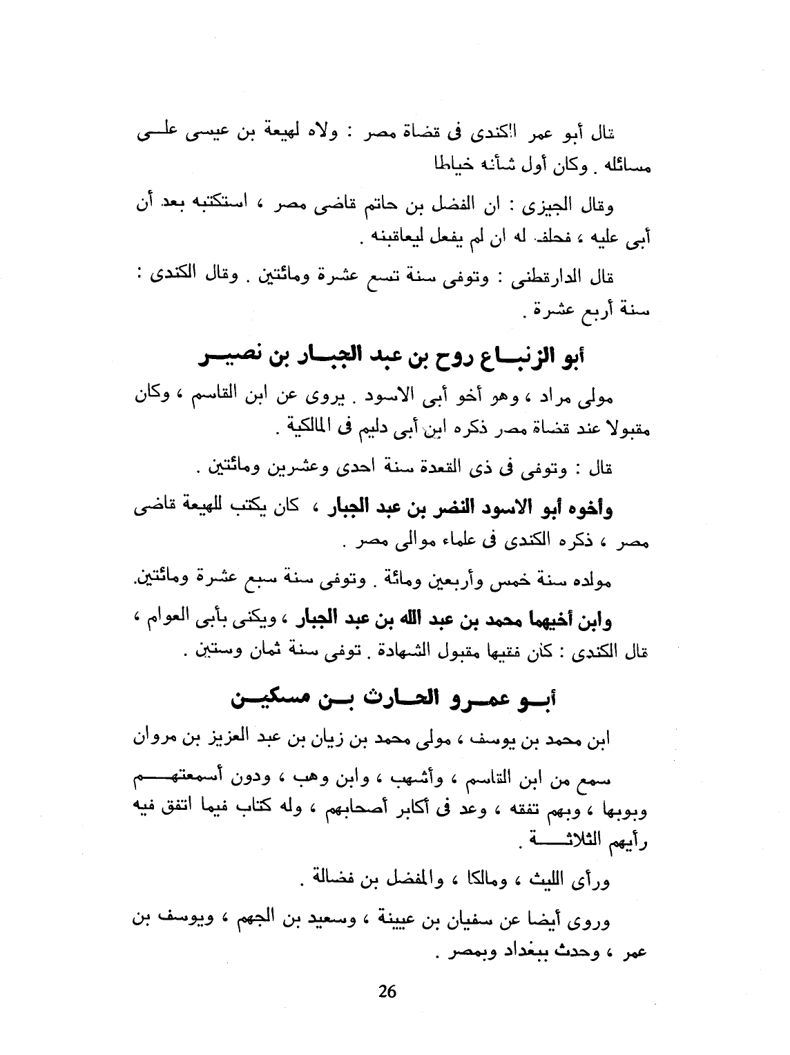 مولى مراد. وهو أخو أبي الأسود. يروي عن ابن القاسم، وكان مقبولاً عند قضاة مصر. ذكره ابن أبي دليم في المالكية. قال: وتوفي في ذي القعدة سنة إحدى وعشرين ومائتين. وأخوه أبو الأسود: النضر ابن عبد الجبار. كان يكتب للهيعة، قاضي مصر. ذكره الكندي في علماء موالي مصر، مولده سنة خمس وأربعين ومائة، وتوفي سنة سبع عشرة ومائتين، وابن أخيهما محمد بن عبد الله بن عبد الجبار، يكنى أبي العوام. قال الكندي: كان فقيهاً مقبول الشهادة توفي سنة ثمان وستين.