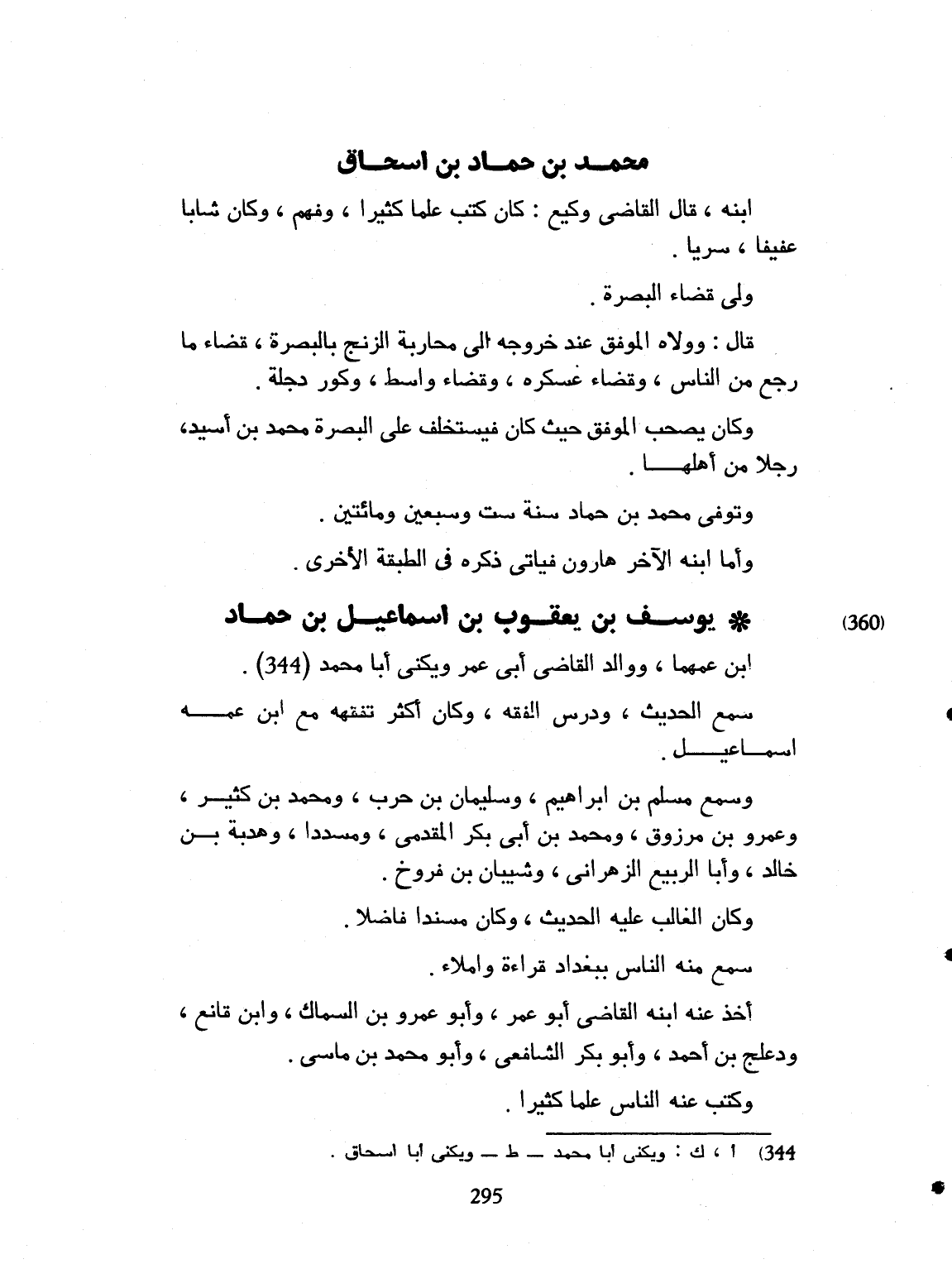 ابن عمهما. ووالد القاضي أبي عمر، ويكنى أبا محمد. سمع الحديث، ودرس الفقه. وكان أكثر تفقهه مع ابن عمه اسماعيل. وسمع مسلم بن ابراهيم، وسليمان بن حرب، ومحمد بن كثير، وعمرو بن مرزوق، ومحمد ابن أبي بكر المقدسي، وهدبة بن خالد، وأبا الربيع الزهراني، وشيبان بن فروخ. وكان الغالب عليه: الحديث. وكان مسنداً فاضلاً، سمع منه الناس ببغداد، قراءة وإملاءً. أخذ عنه ابنه القاضي، أبو عمر، وأبو عمرو بن السماك، وابن قانع، ودعلج بن أحمد، وأبو بكر الشافعي، وأبو محمد بن ماسي، وكتب عنه الناس علماً كثيراً.