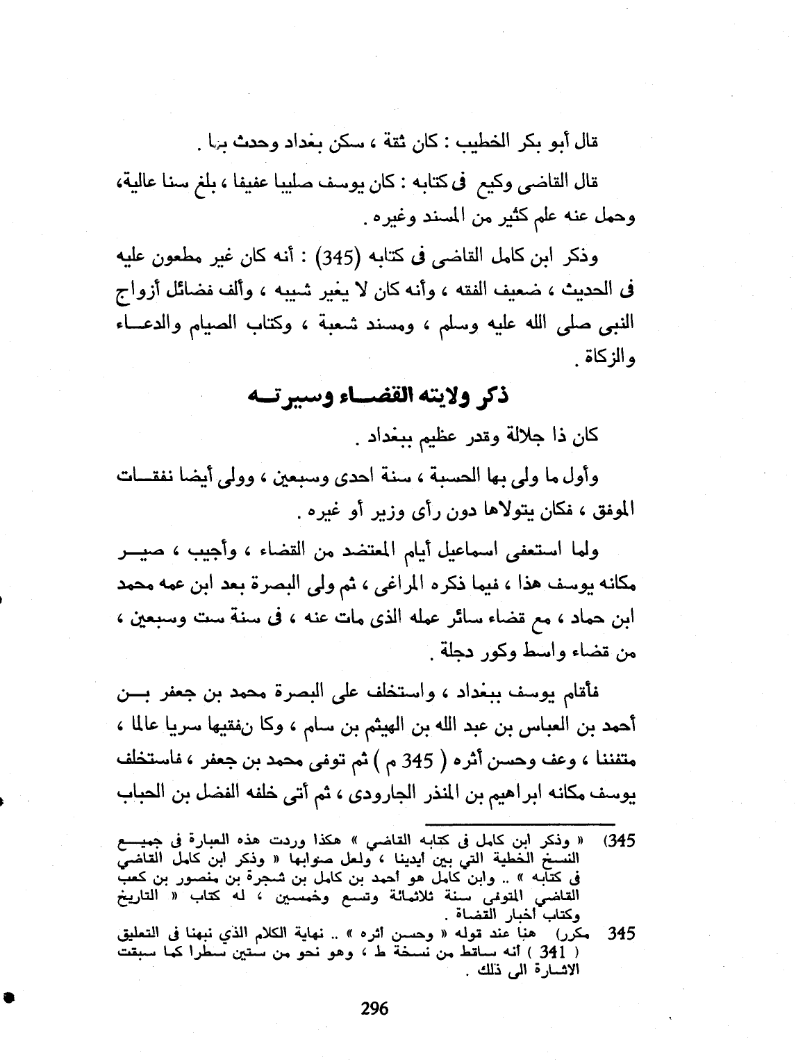 كان ذا جلالة وقدر عظيم ببغداد. وأول ما ولي بها: الحسبة، سنة إحدى وسبعين. وولي أيضاً نفقات الموفق، فكان يتولاها دون رأي وزير أو غيره. ولما استعفى اسماعيل، أيام المعتضد من القضاء، وأجيب صير مكانه يوسف هذا. فيما ذكره الفرغاني. ثم ولي البصرة بعده ابن عمه، محمد بن حماد، مع قضاء سائر عمله، الذي مات عنه، في سنة ست وسبعين من قضاء واسط، وكور دجلة. فأقام يوسف ببغداد، واستخلف على البصرة محمد بن جعفر بن أحمد بن العباس بن عبد الله بن الهيثم بن سام، وكان فقيهاً سرياً عالماً متفنناً وعف وحسن أثرُه. ثم توفي محمد بن جعفر، فاستخلف يوسف مكانه، ابراهيم بن المنذر الجارودي. ثم أتى خليفة الفاضل بن الحباب