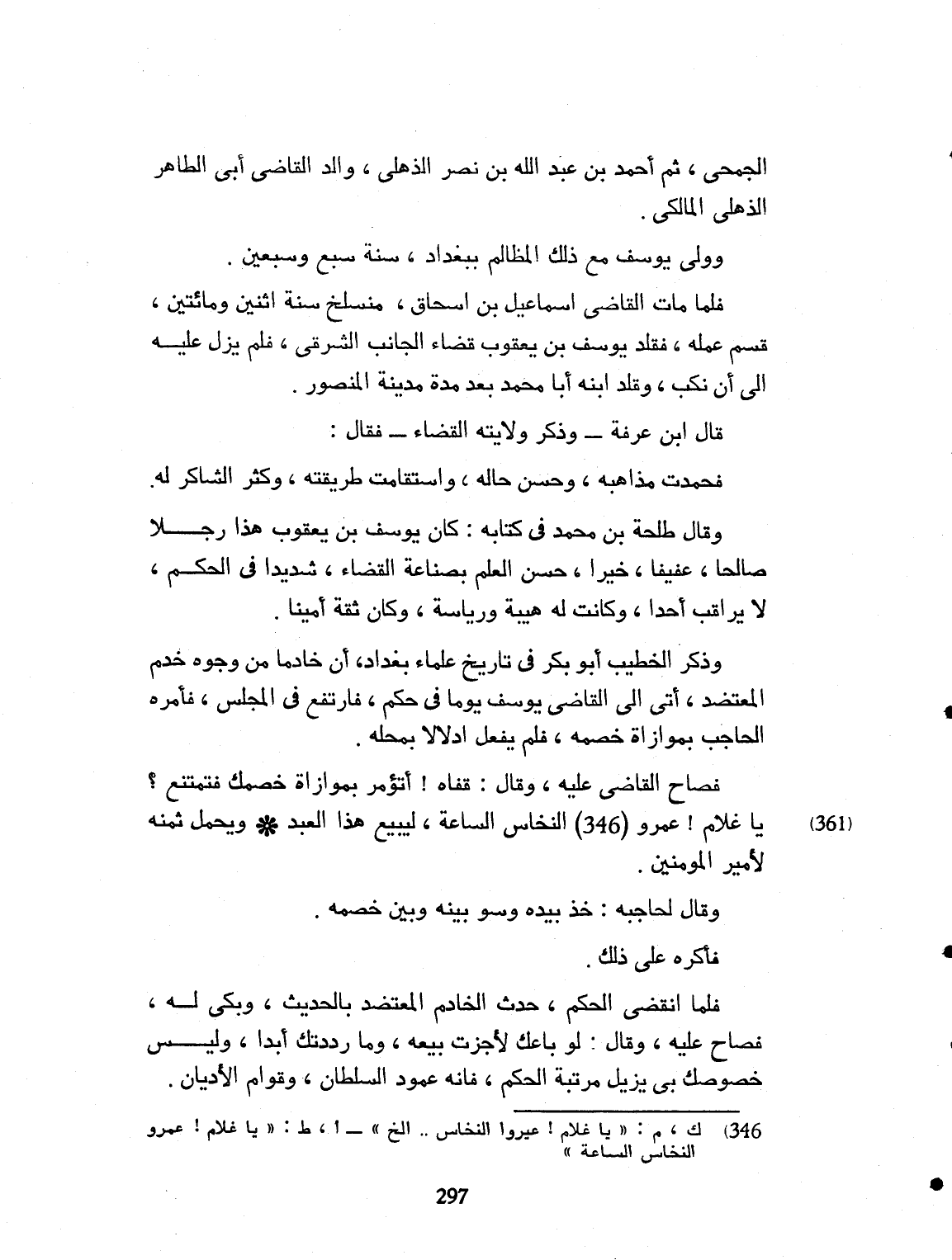 الجمحي، ثم أحمد بن عبد الله بن نصر الذهلي، والد القاضي أبي الطاهر بن علي المالكي. وولي يوسف مع ذلك، المظالم، ببغداد، سنة سبع وسبعين. فلما مات القاضي اسماعيل بن إسحاق منسلخ سنة اثنين ومائتين، قُسِّم عمله، فقلّد يوسف بن يعقوب، قضاء الجانب الشرقي. فلم يزل عليه، الى أن نُكب. وقلد ابنه أبا محمد، بعد مدة، مدينة المنصور. قال ابن عرفة: وذكر ولايته القضاء. قال: فحمدت مذاهبه، وحسُن حكمه. واستقامت طريقته. وكثر الشاكر له. وقال طلحة بن محمد في كتابه: كان يوسف بن يعقوب هذا، رجلاً صالحاً، عفيفاً، خيراً، حسن العلم بصناعة القضاء. شديداً في الحكم. لا يراقب فيه أحداً. وكانت له هيبة، ورئاسة. وكان ثقة أميناً. وذكر الخطيب أبو بكر في تاريخ علماء بغداد. أن خادماً من وجوه خدماء المعتضد، أتى الى القاضي يوسف يوماً، في حكم. فارتفع في المجلس، فأمره الحاجب بموازاة خصمه. فلم يفعل، إدلالاً له بمحلّه. فصاح القاضي عليه، وقال: قفاه، أتؤمر، بموازاة خصمك، فتمتنع؟ يا غلام عمرو النخاس الساعة، يقدَّم إليه يبيع هذا العبد. ويحمل ثمنه لأمير المؤمنين. وقال لحاجبه: خذ بيده، وسوّ بينه وبين خصمه. فأكره على ذلك. فلما انقضى الحكم حدّث الخادم المعتضد بالحديث، وبكى له. فصاح عليه. وقال: لو باعك لأجزت بيعه. وما رددتك أبداً. وليس خصومك لي يزيل مرتبة الحكم. فإنه عمود السلطان. وقوام الأديان.