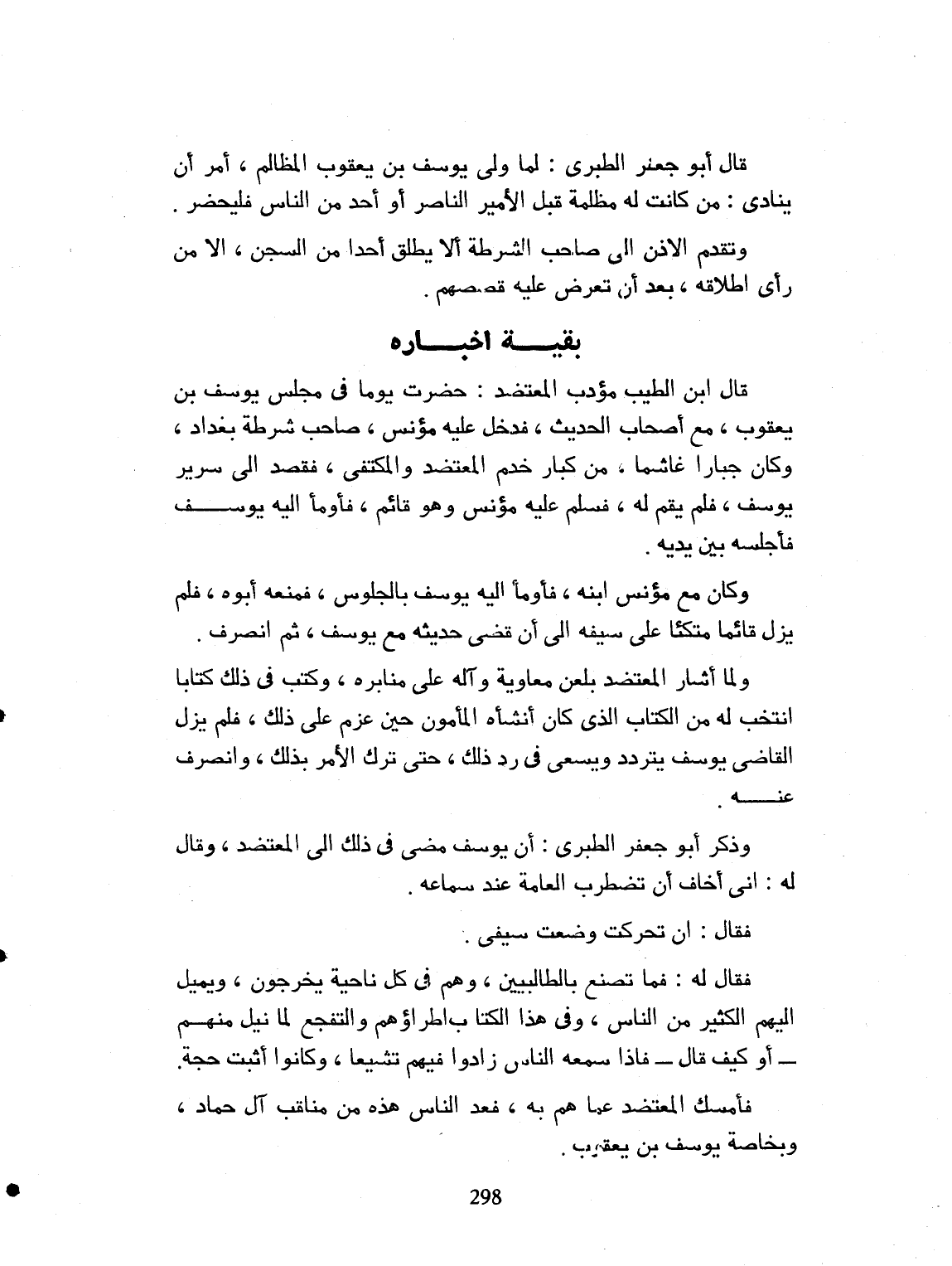 وقال ابن الخطيب مؤدب المعتضد: حضرت يوماً في مجلس يوسف بن يعقوب، مع أصحاب الحديث، فدخل عليه مؤنس صاحب شرطة بغداد. وكان جبّاراً غاشماً، من كبار خدّام المعتضد، والمكتفي، فقصد الى سرير يوسف. فلم يقم له. فسلّم عليه مؤنس، وهو قائم. فأومأ إليه يوسف، فأجلسه بين يديه. وكان مع مؤنس الى أن قضى حديثه، مع يوسف، ثم انصرف. ولما أشار المعتضد بلعن معاوية وآله، على من أمره. وكتب في ذلك، كتاباً. انتخب له من الكتاب، الذي كان أنشأه المأمون، حين عزم على ذلك. فلم يزل القاضي يوسف يتردد، ويسعى في رد ذلك، حتى ترك الأمر بذلك، وانصرف عنه. فذكر أبو جعفر الطبري: أن يوسف مضى في ذلك الى المعتضد، وقال له: إني أخاف أن تضطرب العامة عند سماعه. فقال: إن تحركت وضعت سيفي. فقال له ما تصنع بالطالبيين، وهم في كل ناحية. يخرجون ويميل إليهم الكثير من الناس. وفي هذا الكتاب إطراؤهم والتفجّع لما نيل منهم، أو كيف؟ قال: فإذا سمعه الناس زادوا فيهم تشيّعاً. وكانوا أثبت حجة. فأمسك المعتضد عما همّ به. فعد الناس هذه من مناقب ابن حماد، بخاصة ليوسف بن يعقوب.