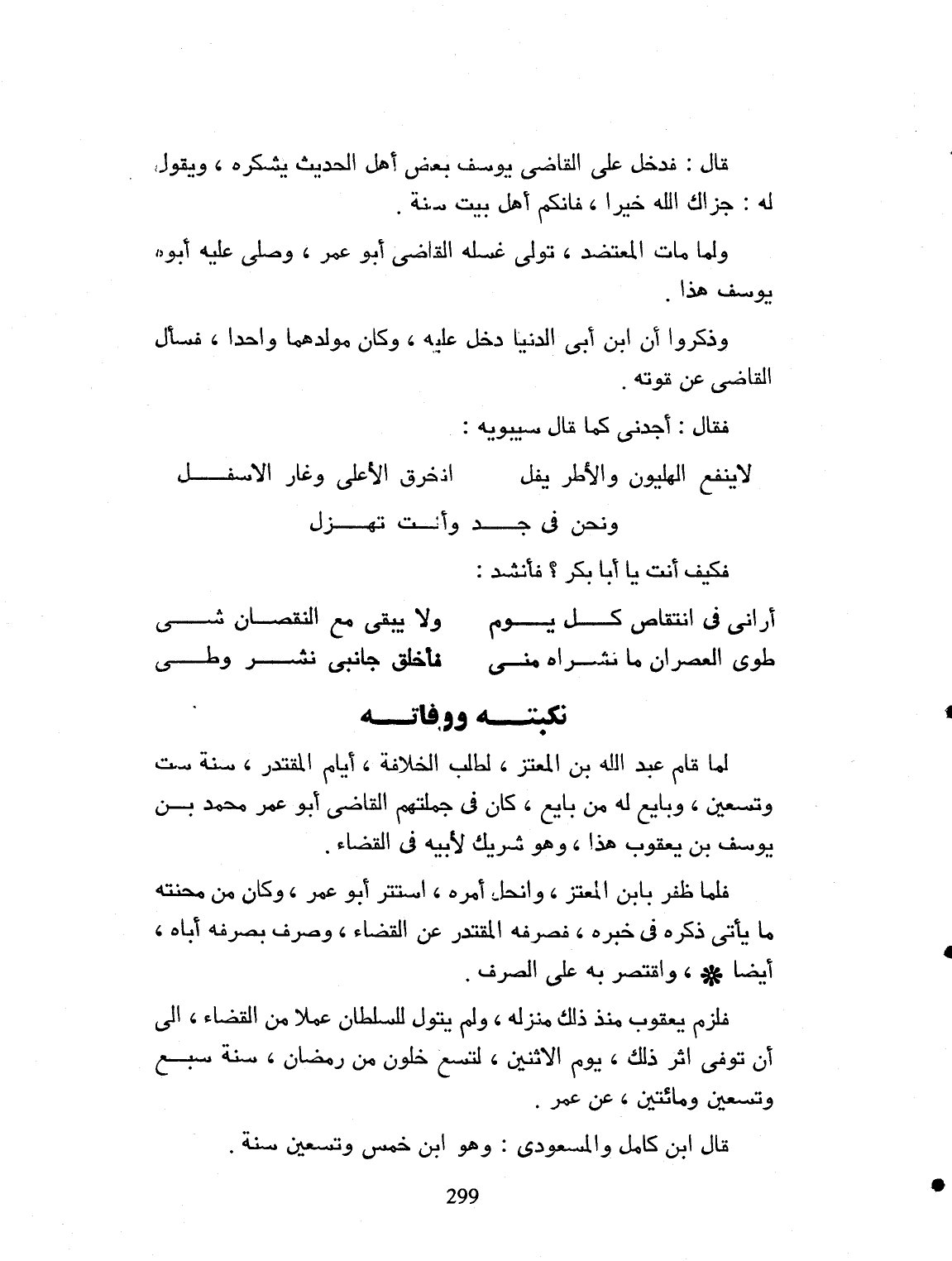 قال: فدخل على القاضي يوسف بعض أهل الحديث، يشكره ويقول: جزاك الله خيراً. فإنكم أهل بيت سنة. ولما مات المعتضد، تولى غسله القاضي أبو عمر. وصلى عليه أبوه يوسف هذا. وذكروا أن ابن أبي الدنيا، دخل عليه. وكان مولدهما واحد. فسأل القاضي عن قوته، فقال: أجدني كما قال سيبويه: