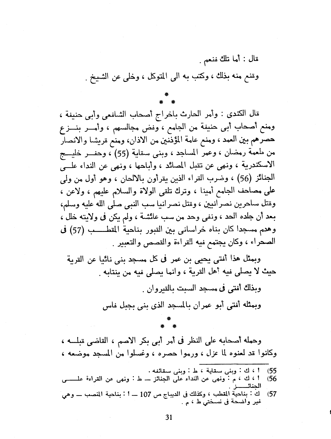 فقال أما تلك فنعم. وقنع منه بذلك. وكتب به إلى المتوكل، وخلي عن الشيخ. قال الكندي: وأمر الحارث بإطراح أصحاب الشافعي وأبي حنيفة. ومنع أصحاب أبي حنيفة من الجامع، وفض مجالسهم، وأمر بنزع حصورهم بين العُمد. ومنع عامة المؤذنين من الآذان. ومنع قريشاً والأنصار من طعمة رمضان. وعمر المساجد، فبنى سقاية. وحفر خليج الإسكندرية. ونهى عن تقبل المصائد، وأباحها ونهى عن النداء على الجنائز، وضرب القراء الذين يقرأون بالألحان. وهو أول من ولي على مصاحف الجامع أميناً. وترك تلفي الولاة والسلام عليهم. ولاعن. وقتل ساحرين نصرانيين وقتل نصرانياً سبًّ النبيّ صلى الله عليه وسلم، بعد أن جلده الحد. ونفى وحد من سبَّ عائشة. ولم يكن في ولايته خلل. وهدّم مسجداً، كان بناه خراساني، بين القبور، بناحية القطب؟ في الصحراء. وكان يجتمع فيه للقراءة والقصص والتعبير، وبمثل هذا أفتى يحيى بن عمر في كل مسجد بني نائباً عن القرية. حيث لا يصلي فيه أهل القرية. وإنما يصلي فيه من ينتابه، وبذلك أفتى في مسجد السبت بالقيروان، وبمثله أفتى أبو عمران في المسجد الذي بني بجيل فاس، وحمله أصحابه على النظر في أمر أبي بكر الأصم القاضي قبله. وكانوا قد لعنوه لما عزل ورموا حصره، وغسلوا من المسجد موضعه.