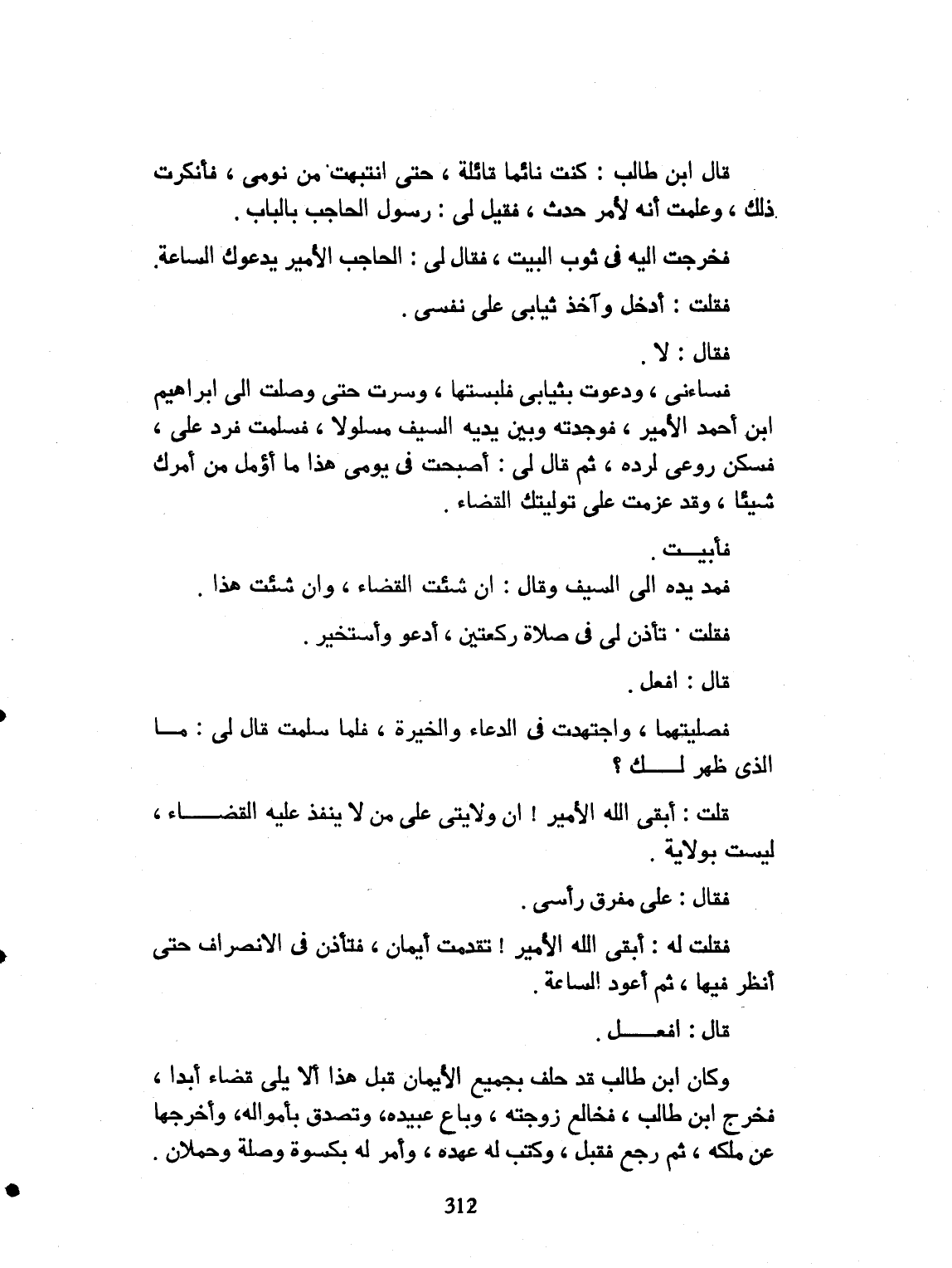قال لي ابن طالب: كنت نائماً قائلة، حتى انتبهت من نومي، فأنكرت ذلك، وعلمت أنه لأمر حدث. فقيل لي: رسول الحاجب بالباب. فخرجت إليه في ثوب البيت. فقال لي الحاجب: الأمير يدعوك الساعة. فقلت: أدخل، وأخذ ثيابي على نفسي. فقال لا. فساءني، ودعوت بثيابي فلبستها. وسرت حتى وصلت الى ابراهيم بن أحمد الأمير. فوجدته وبين يديه السيف مسلولاً. فسلمت، فردّ علي فسكن روعي، لرده. ثم قال لي: احتجت في يومي الى ابن طاهر، ما أوفاه من أمرك شيئاً. وقد عزمت على توليتك القضاء، فأبيت. فمد يده الى السيف، وقال: إن شئت القضاء. وإن شئت هذا. فقلت تأذن لي في صلاة ركعتين أدعو وأستخير. قال: أفعل. فصليتهما، واجتهدت في الدعاء والخيرة. فلما سلمت، قال لي: ما ظهر لك. قلت أبقى الله الأمير، إن ولاني علي ما لا ينفذ عليه القضاء، ليست بولاية. فقال: عل مفرق رأسي. فقلت له: أبقى الله الأمير، تقدمت الإيمان، فآذن في الانصراف، حتى أنظر فيها، ثم أعود الساعة. قال: أفعل. وكان ابن طالب، قد حلف بجميع الإيمان قبل هذا، ألا يلي قضاء أبداً. فخرج ابن طالب، فخالع زوجته، وباع عبيده، وتصدّق بأمواله، وأخرجها من ملكه. ثم رجع فقبل. وكتب له عهده، وأمر له بكسوة، ووصله وحمله.