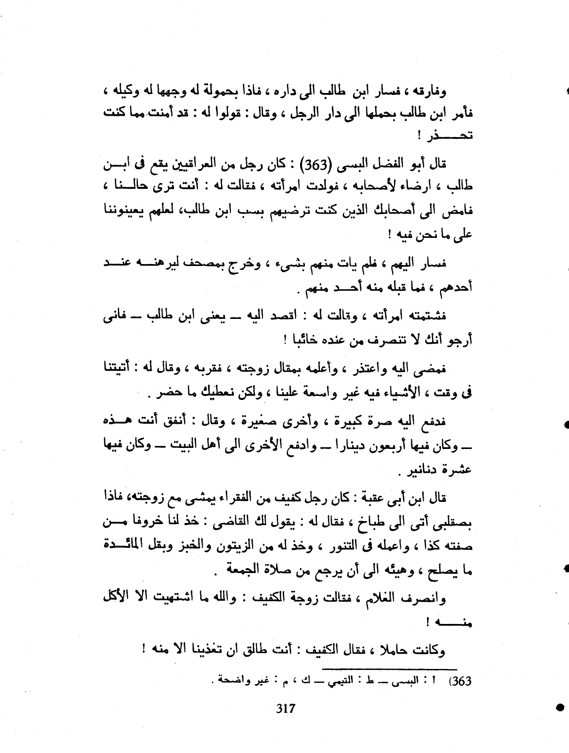 وفارقه. فسار ابن طالب الى داره، فإذا الحمولة له، وجهها له وكيله. فأمر ابن طالب بحملها الى دار الرجل، وقال قولوا له: قد أمنت مما كنت تجده. قال أبو الفضل: كان رجل من العراقيين يقع في ابن طالب، إرضاء لأصحابه، فولدت له امرأته، فقالت له: أنت ترى حالنا، فامض الى أصحابك الذين كنت ترضيهم، بسب ابن طالب، لعلهم يعينونا على ما نحن عليه. فسار إليهم. فلم يأت منهم بشيء. وخرج، بمصحف يرهنه عند زحدهم، فما قبله منه أحد منهم.