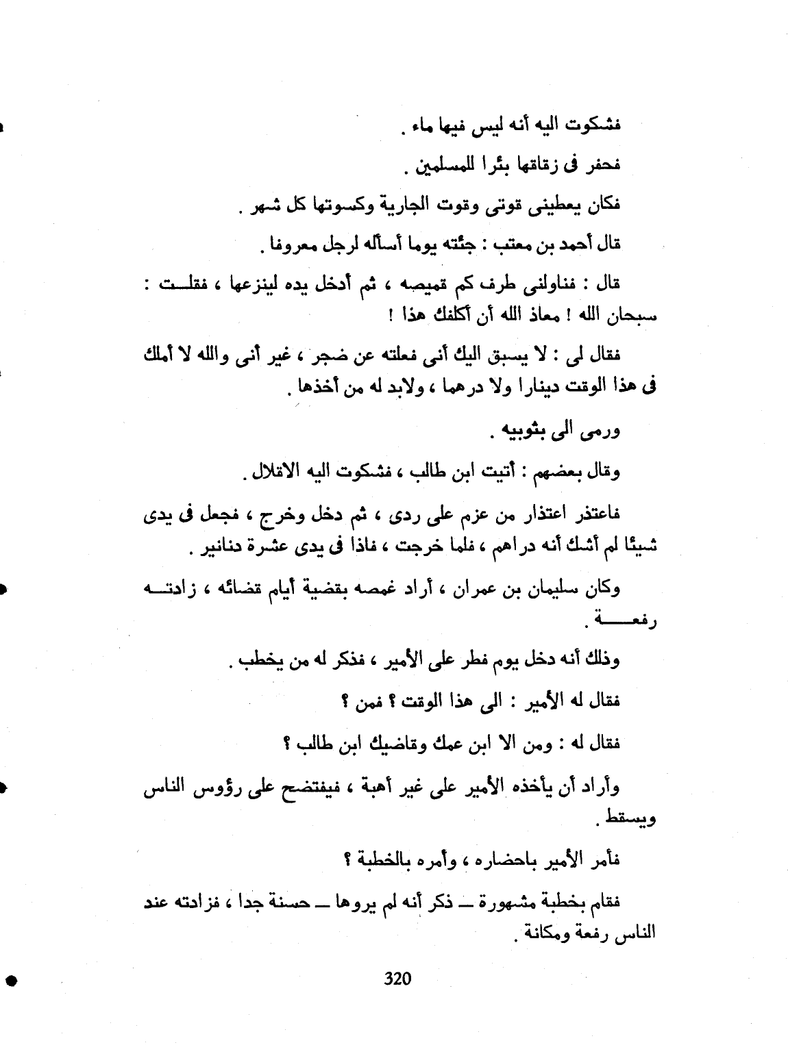 فشكوت إليه أنه ليس فيها ماء. فحفر في زقاقها بئراً، للمسلمين. فكان يعطي قوتي، وقوت الجارية وكسوتها كل شهر. قال أحمد بن معتب: جئته يوماً أسأله لرجل معروفاً. قال: فناولني طرف كم قميصه، ثم أدخل يده لينتزعه. فقلت: سبحان الله، معاذ الله، أن أكلفك هذا. فقال لي: لا يسبق إليك أني فعلته عن ضجر، غير أني والله لا أملك في هذا الوقت ديناراً ولا درهماً، ولابد له من أخذها. ومدّ رليّ بثوبه. وقال بعضهم: أتيت ابن طالب فشكوت إليه الإقلال، فاعتذر اعتذار من عزم على ردّي. ثم دخل، وخرج، وجعل في يدي شيئاً لم أشك أنها دراهم، فلما خرجت إذا في يدي عشرة دنانير. وكان سليمان بن عمران، أراد غمطه بقضية، أيام قضائه، زادته رفعة. وذلك أنه دخل يوم فطر على الأمير، فذكر له من يخطب. فقال له الأمير: الى هذا الوقت؟ فمن؟ فقال له: ومن إلا ابن عمك وقاضيك ابن طالب؟ وأراد أن يأخذه الأمير على غير أهبة، فيفتضح رؤوس الناس، ويسقط. فأمر الأمير بإحضاره وأمره بالخطبة، فقام بخطبة مشهورة. وذكر أنه لم يروها. حسنة جداً.