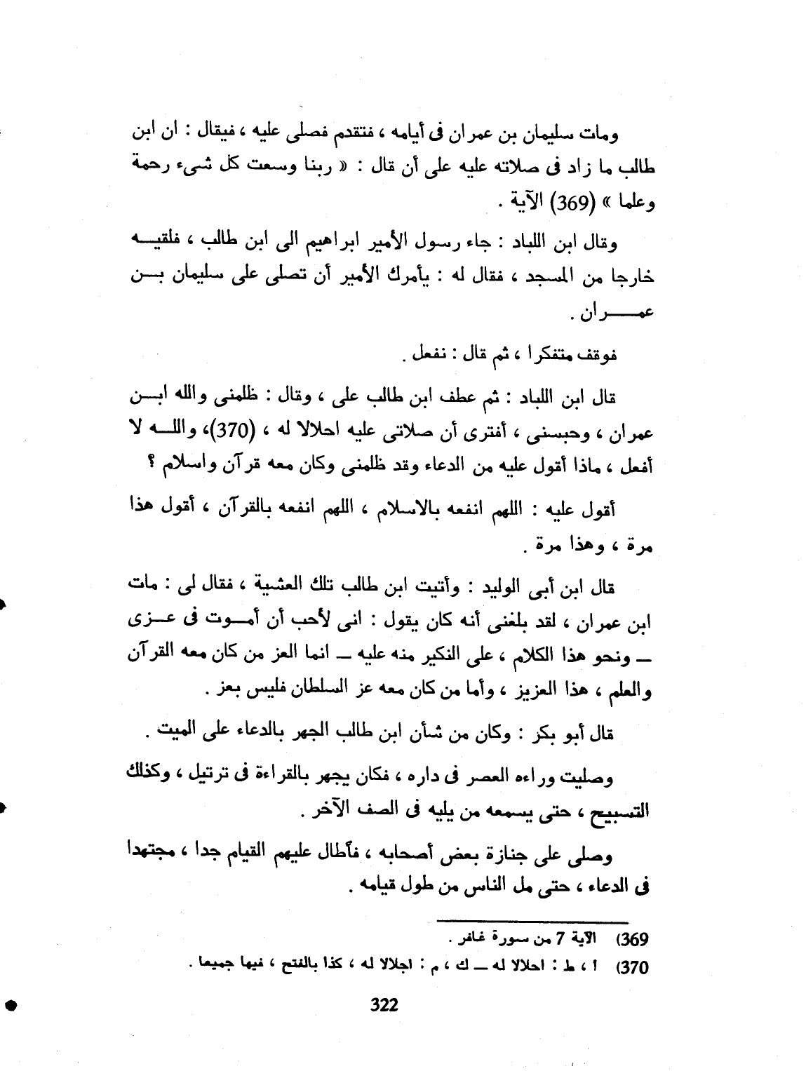 ومات سليمان بن عمران، في أيامه، فتندم، فصلى عليه. فيقال إن ابن طالب ما زاد في صلاته عليه أن قال: " ربّنا وسِعْتَ كل شيء رحمةً وعِلماً " الآية. وقال ابن اللباد: جاء رسول الأمير ابراهيم، الى ابن اللباد، فلقيه خارجاً من المسجد. فقال له: يأمرك الأمير أن تصلي على سليمان بن عمران. فوقف متفكراً ثم قال: نفعل. قال ابن اللباد: ثم عطف ابن طالب عليّ، وقال ظلمني والله ابن عمران، وحبسني، أفترى أن صلاتي عليه، إجلالاً له؟ والله لا أفعل. ماذا أقول عليه من الدعاء. وقد ظلمني. وكان معه قرآن، وإسلام. أقول عليه: اللهم انفعه بالإسلام. أقول هذا مرة. وأقول هذا مرة. قال ابن أبي الوليد: وأتيت ابن طالب تلك العشية. فقال لي: مات ابن عمران. لقد بلغني أنه كان يقول: إني لا أحب أن أموت في عزي، ونحو هذا الكلام، على النكير منه عليه. إنما العز لمن كان معه القرآن والعلم. هذا العزيز. وأما من كان معه عز السلطان، فليس بعزيز في داره. فكان يجهر بالقراءة بترتيل. وكذلك التسبيح حتى يسمعه من يليه في الصف الآخر. وصلى على جنازة بعض أصحابه، فأطال عليهم القيام، جداً مجتهداً في الدعاء، حتى ملّ الناس من طول قيامه.