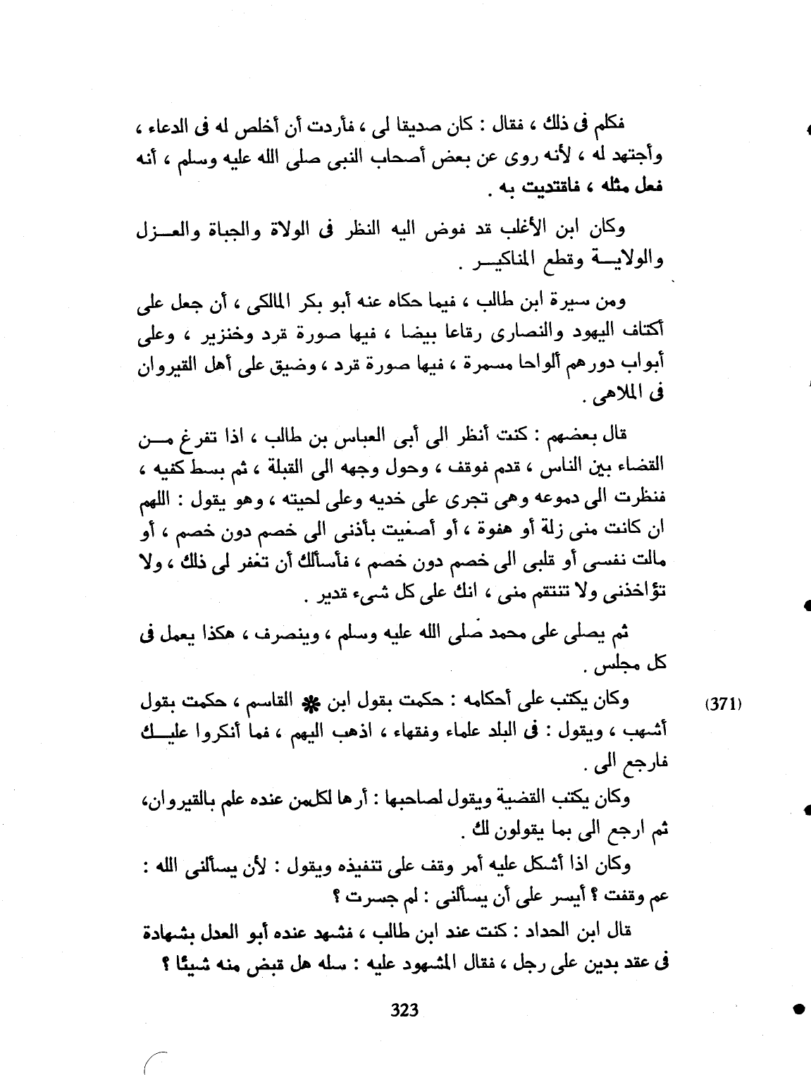 فكُلِّم في ذلك. فقال: كان لي صديقاً، فأردت أن أخلص له في الدعاء، وأجتهد له. لأنه رُوي عن بعض أصحاب النبي صلى الله عليه وسلم، أنه فعل مثله فاقتديت به. وكان ابن الأغلب، قد فوض إليه النظر في الولاة والجباة، والعدل والولاية، وقطع المناكير. ومن سيرة ابن طالب فيما حكاه عنه أبو بكر المالكي: أنه جعل على أكتاف اليهود والنصارى، رقاعاً بيضاً. فيها: صور قرد وخنزير. وعلى أبواب دورهم ألواح مسمرة، فيها صورة قرد. وضيق على أهل القيروان في الملاهي.