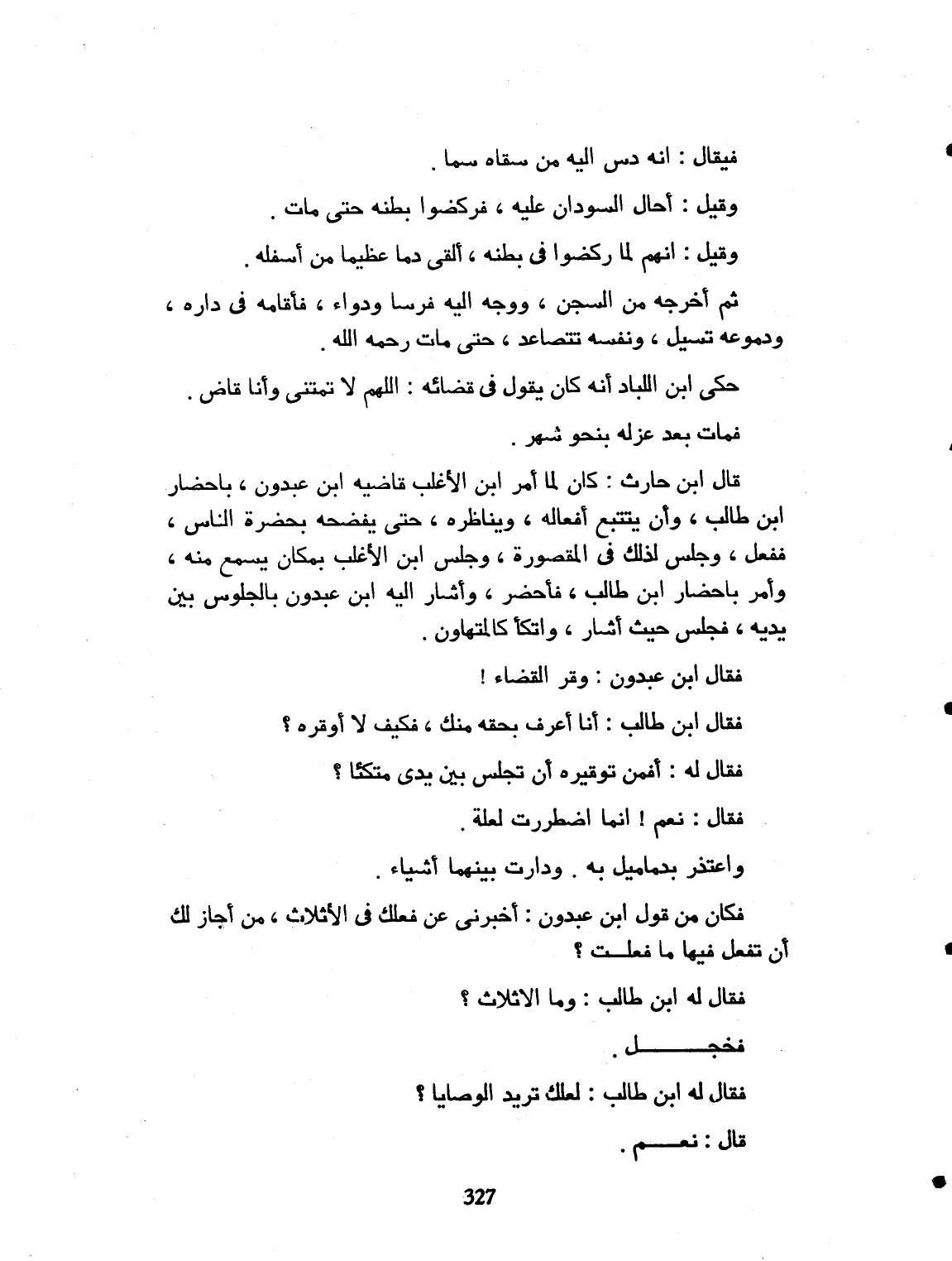 وجلس ابن الأغلب بمكان يسمع منه. وأمر بإحضار ابن طالب، فأحضر. وأشار إليه ابن عبدون وتم القضاء. فقال ابن طالب: أنا أعرف بحقه منك. فكيف لا أوقره. فقال له: فمن توقيره أن تجلس بين يديّ، متكئاً؟ فكان من قول ابن عبدون: أخبرني عن فعلك، في الأثلاث؟ من أجاز لك أن تفعل فيها ما فعلت؟ فقال ابن طالب: وما الأثلاث؟ فخجل. فقال له ابن طالب: لعلك تريد الوصايا؟ قال: نعم.