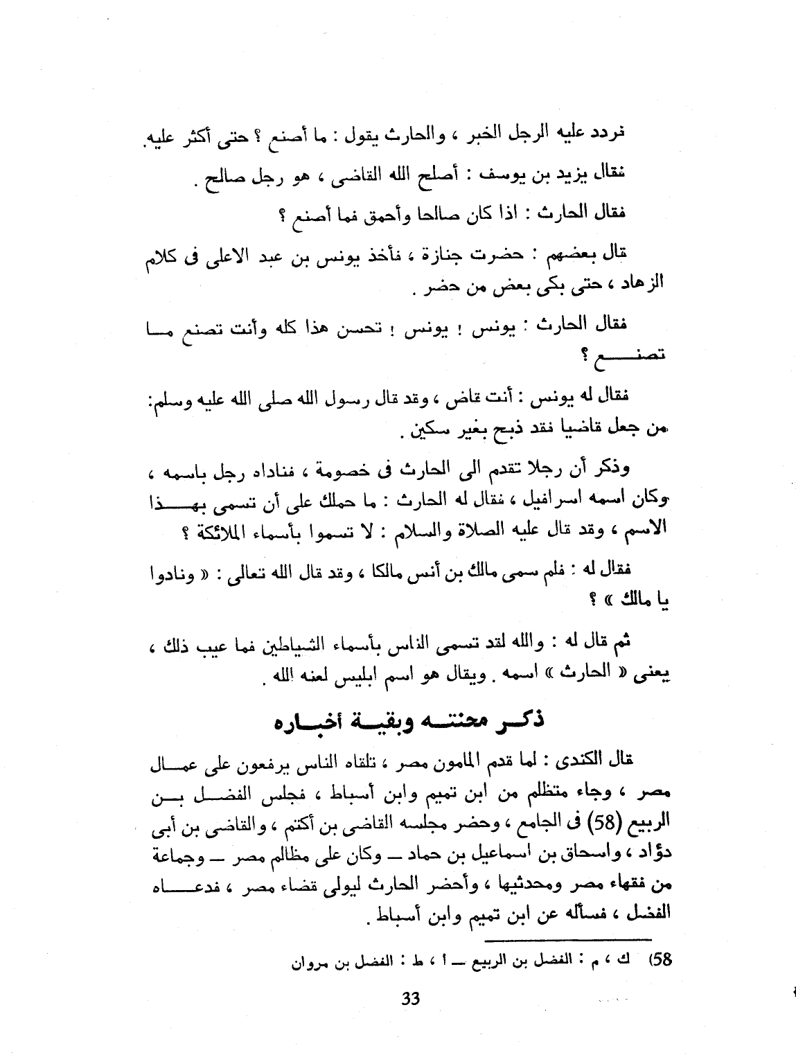 عليه الرجل الخبر، والحارث يقول: ما أصنع به، حتى أكثر عليه. فقال يزيد بن يوسف: أصلح الله القاضي، هو رجل صالح. فقال له الحارث: إذا كان صالحاً وأحمق، فما أصنع. قال بعضهم: حضرت جنازة. فأخذ يونس بن عبد الأعلى في الكلام والرشاد حتى بكى بعض من حضر، فقال الحارث: يونس، تحسن هذا كله، وأنت تصنع ما تصنع. فقال له يونس: أنت قاض، وقد قال رسول الله صلى الله عليه وسلم: من جعل قاضياً فقد ذبح بغير سكين. وذكر أن رجلاً تقدم إلى حارث في خصومة، فناداه رجل باسمه. وكان اسمه إسرافيل. فقال له الحارث ما حملك على أن تسمّى بهذا الاسم؟ وقد قال عليه الصلاة والسلام: لا تسمعوا بأسماء الملائكة. فقال له: فلمَ سمي مالك بن أنس مالكاً؟ وقد قال الله تعالى: ونادوا يا مالك. ثم قال: والله لقد تسمي الناس بأسماء الشياطين. فما عيب ذلك. يعني الحارث اسمه. ويقال هو اسم إبليس لعنه الله. هـ الرجل الخبر، والحارث يقول: ما أصنع به، حتى أكثر عليه. فقال يزيد بن يوسف: أصلح الله القاضي، هو رجل صالح. فقال له الحارث: إذا كان صالحاً وأحمق، فما أصنع. قال بعضهم: حضرت جنازة. فأخذ يونس بن عبد الأعلى في الكلام والرشاد حتى بكى بعض من حضر، فقال الحارث: يونس، تحسن هذا كله، وأنت تصنع ما تصنع. فقال له يونس: أنت قاض، وقد قال رسول الله صلى الله عليه وسلم: من جعل قاضياً فقد ذبح بغير سكين. وذكر أن رجلاً تقدم إلى حارث في خصومة، فناداه رجل باسمه. وكان اسمه إسرافيل. فقال له الحارث ما حملك على أن تسمّى بهذا الاسم؟ وقد قال عليه الصلاة والسلام: لا تسمعوا بأسماء الملائكة. فقال له: فلمَ سمي مالك بن أنس مالكاً؟ وقد قال الله تعالى: ونادوا يا مالك. ثم قال: والله لقد تسمي الناس بأسماء الشياطين. فما عيب ذلك. يعني الحارث اسمه. ويقال هو اسم إبليس لعنه الله.