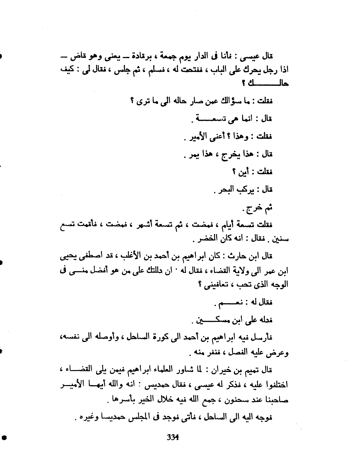 فمضت تسعة أشهر. فأقمت تسع سنين. فقال: إنه الخضر عليه السلام. قال ابن حارث: كان ابراهيم بن أحمد بن الأغلب. قد أحضر يحيى بن عمر، الى ولاية القضاء. فقال له: إن دللتك على من هو أفضل مني، في الوجه الذي تحب. تعافيني؟ قال له: نعم. فدلّه على ابن مسكين. فأرسل فيه ابراهيم بن حماد، الى كورة الساحل. وأوصله الى نفسه. وعرض عليه القضاء فنفر منه. قال تميم بن خير إنه لما شاور العلماء ابراهيم، فيمن يلي القضاء، اختلفوا عليه. فذكر له عيسى، فقال أحمد بن ناجي: والله، أيها الأمير، صاحبنا عند سحنون. جمع الله فيه خلال الخير، بأسرها. فوجه فيه الى الساحل. فأتي به. وفي المجلس حمديس وغيره.