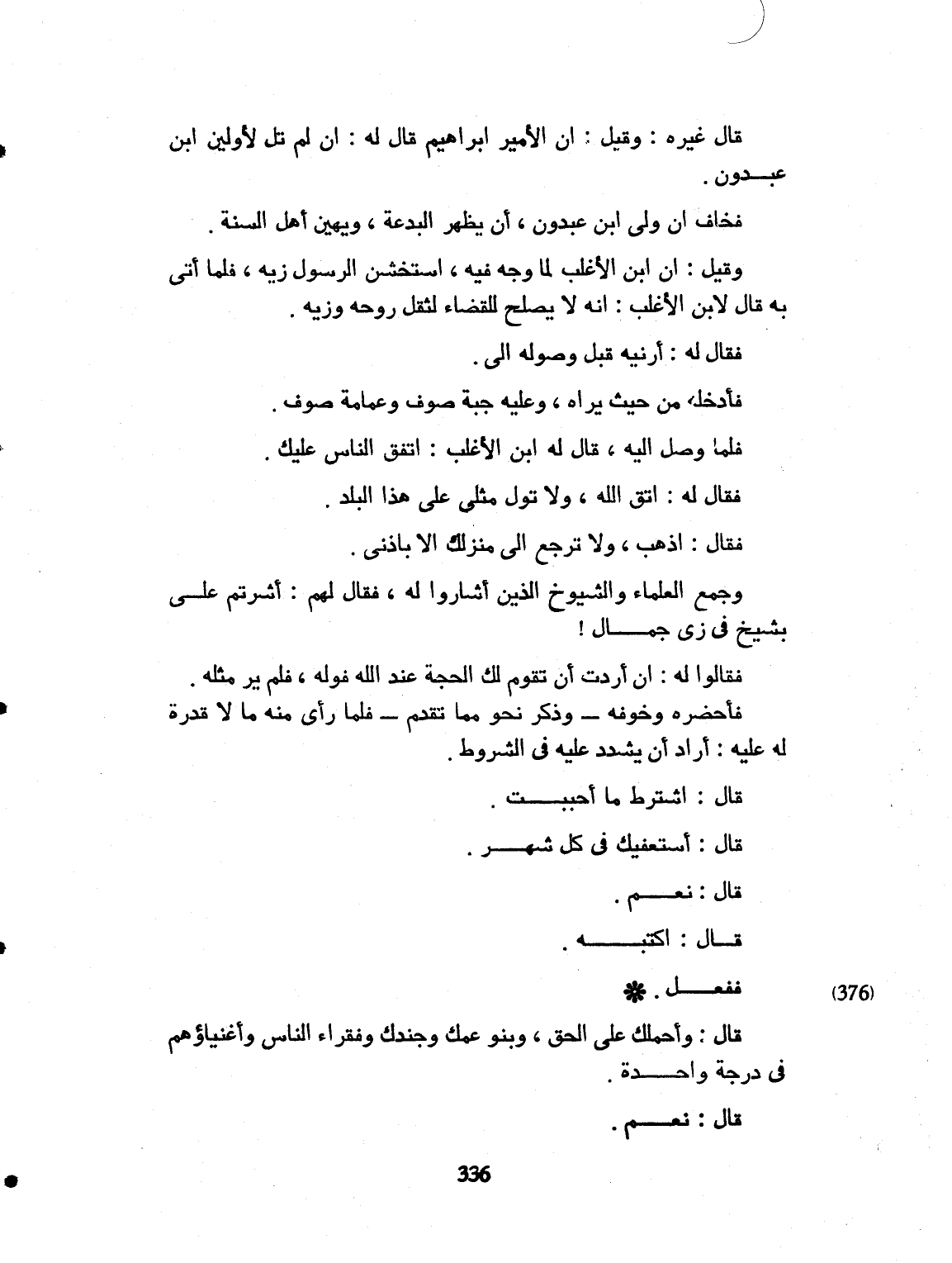 فقال لهم: أشرتم علي بشيخ في زي جَمال. فقالوا إن أردت أن تقوم لك الحجة عند الله، فوله. فلم يرَ مثله. فأحضره وخوفه وذكر نحواً مما تقدم. فلما رأى منه ما رأى، أي ما لا قدرة له عليه. أراد أن يشدد عليه في الشرط. قال اشترط ما أحببت. قال أستعفيك في كل شهر، قال نعم. قال: أكتبه. ففعل. وأحملك وبني عمك، وجندك وفقهاء المسلمين وأغنيائهم في درجة واحدة.